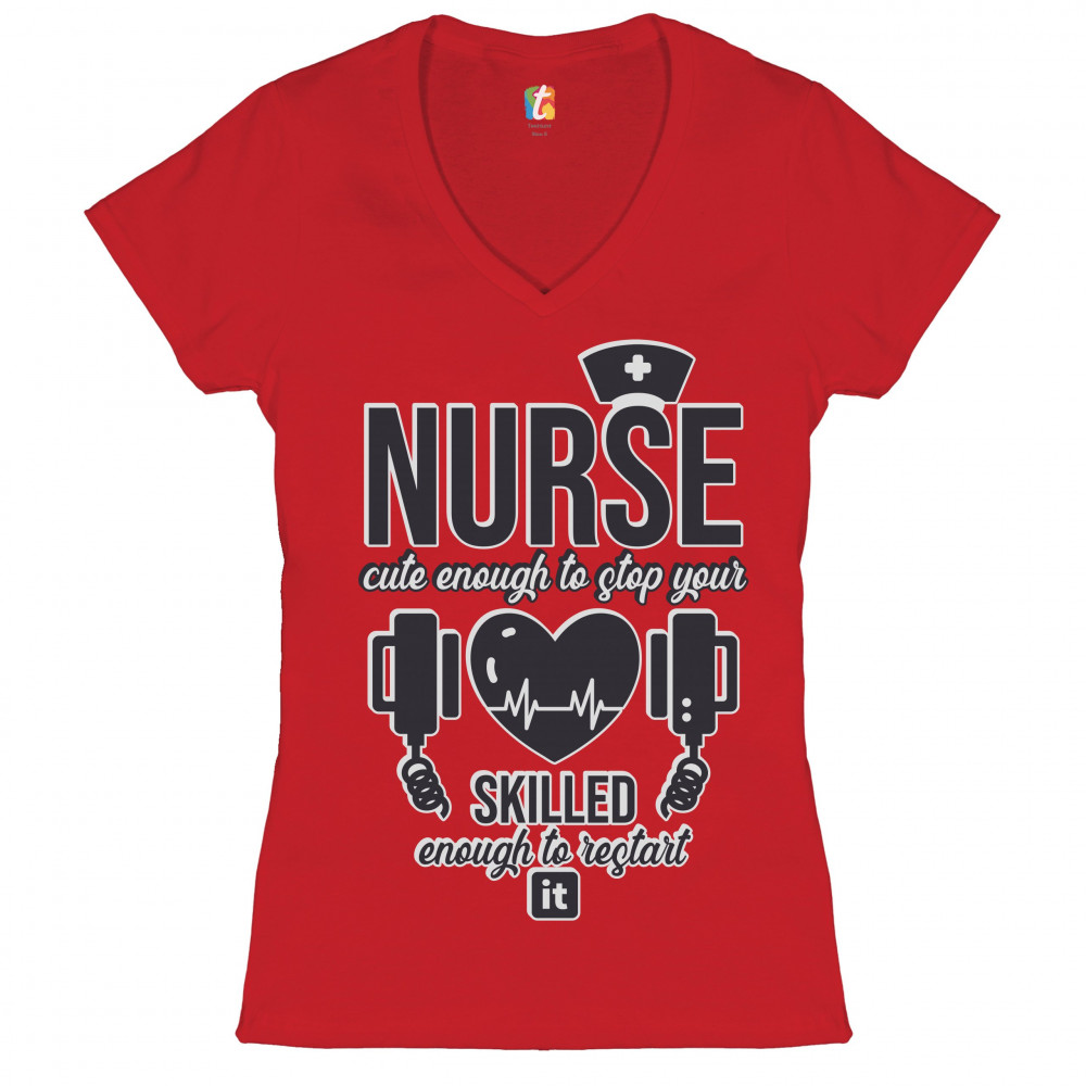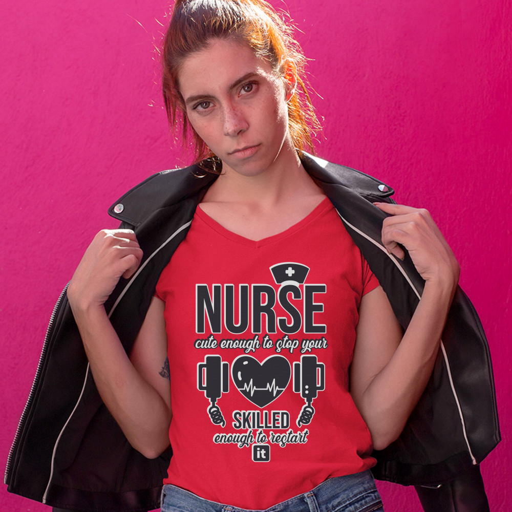 A print saying: "Nurse - Cute Enough to Stop Your Heart, Skilled Enough to Restart It". In the center of the print there is a a heart with two defibrilators to it's sides. A great choice as a gift for a registered nurse, who is busy everyday saving people