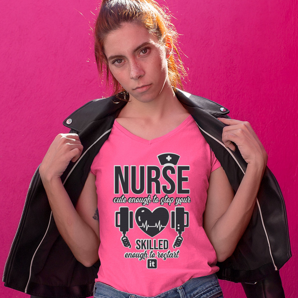 A print saying: "Nurse - Cute Enough to Stop Your Heart, Skilled Enough to Restart It". In the center of the print there is a a heart with two defibrilators to it's sides. A great choice as a gift for a registered nurse, who is busy everyday saving people