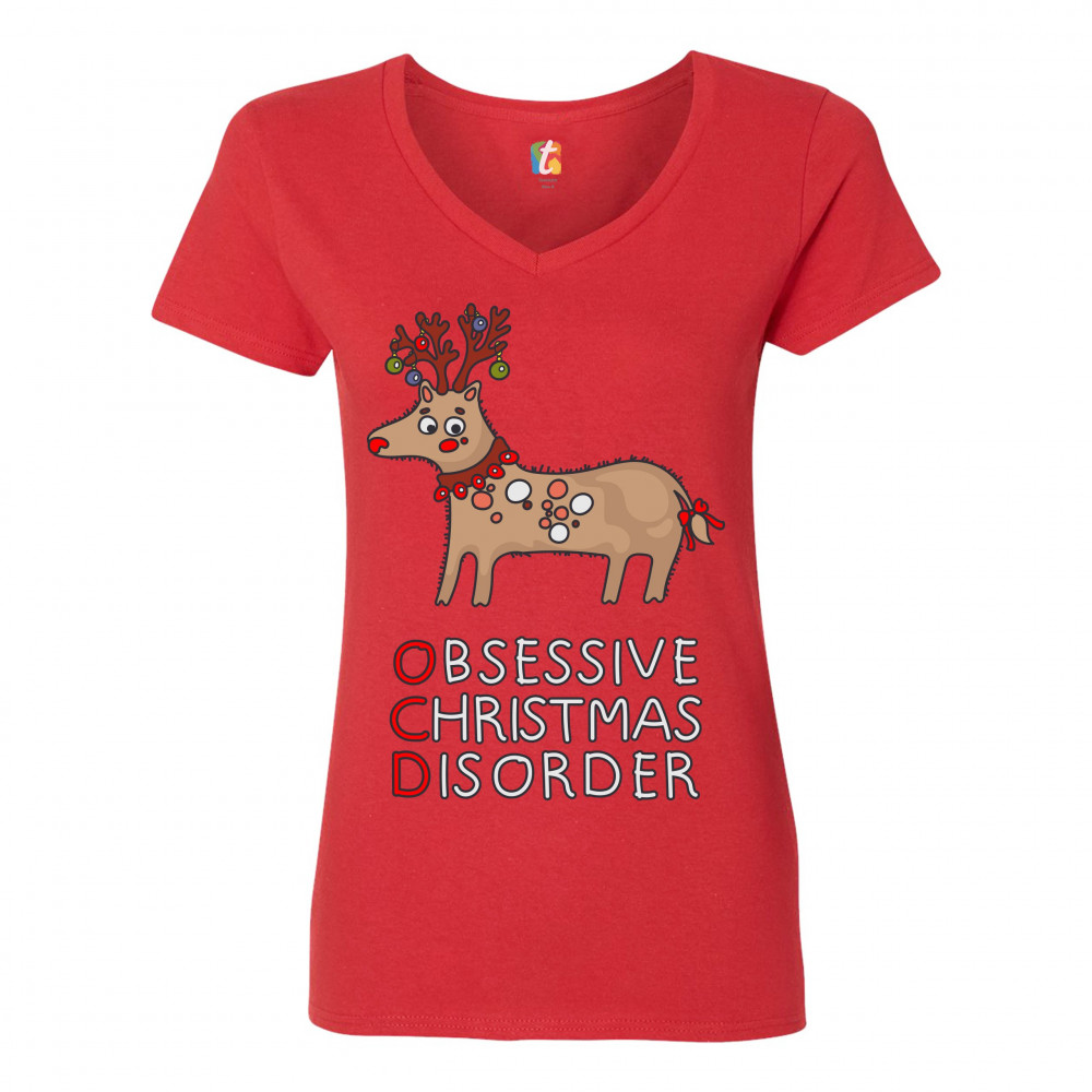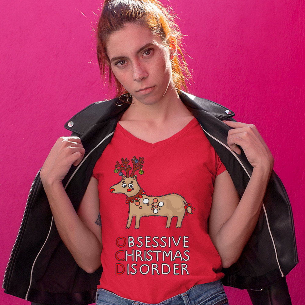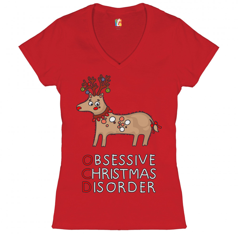 OCD OBSESSIVE CHRISTMAS DISORDER women's v-neck t-shirt reindeer rudolph tee red