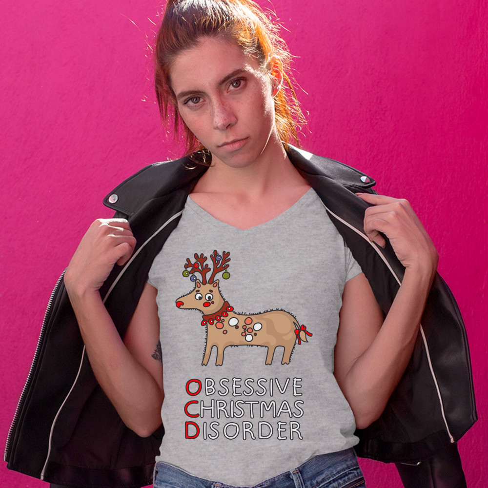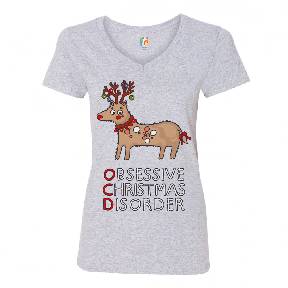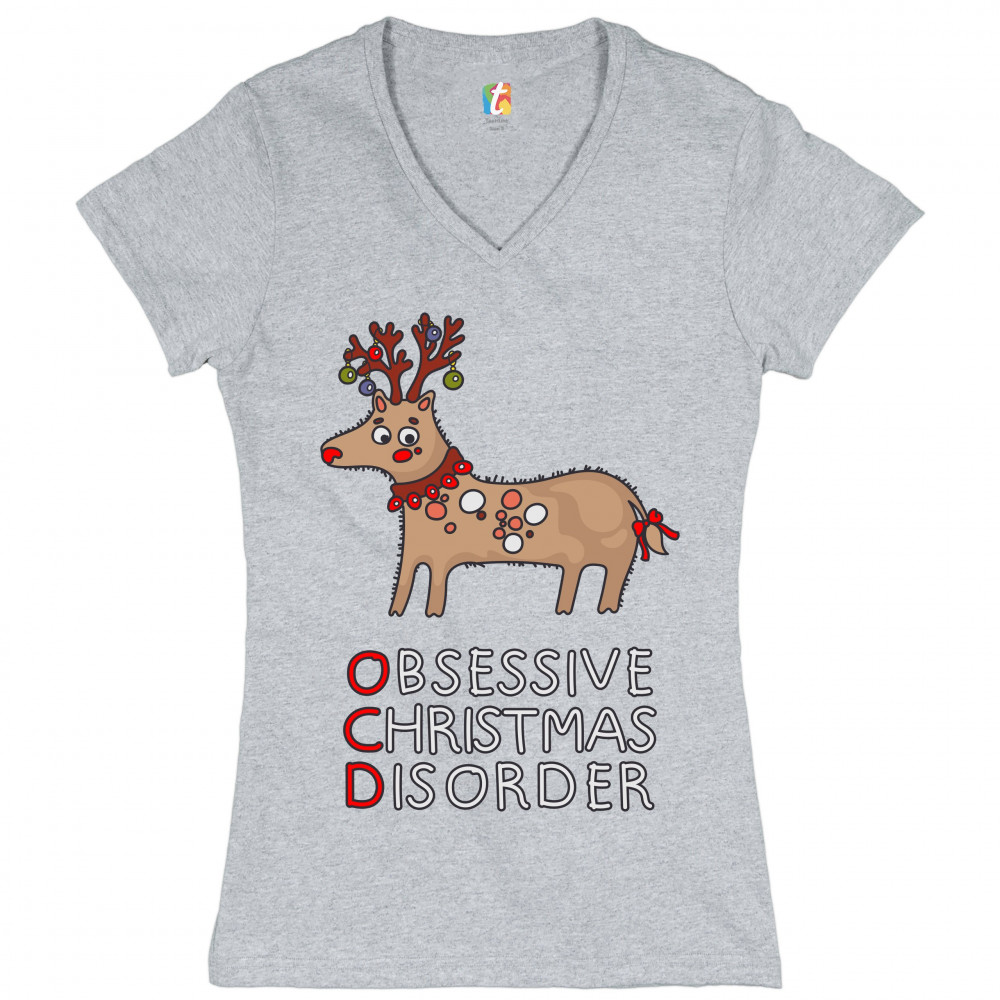 OCD OBSESSIVE CHRISTMAS DISORDER women's v-neck t-shirt reindeer rudolph tee gray