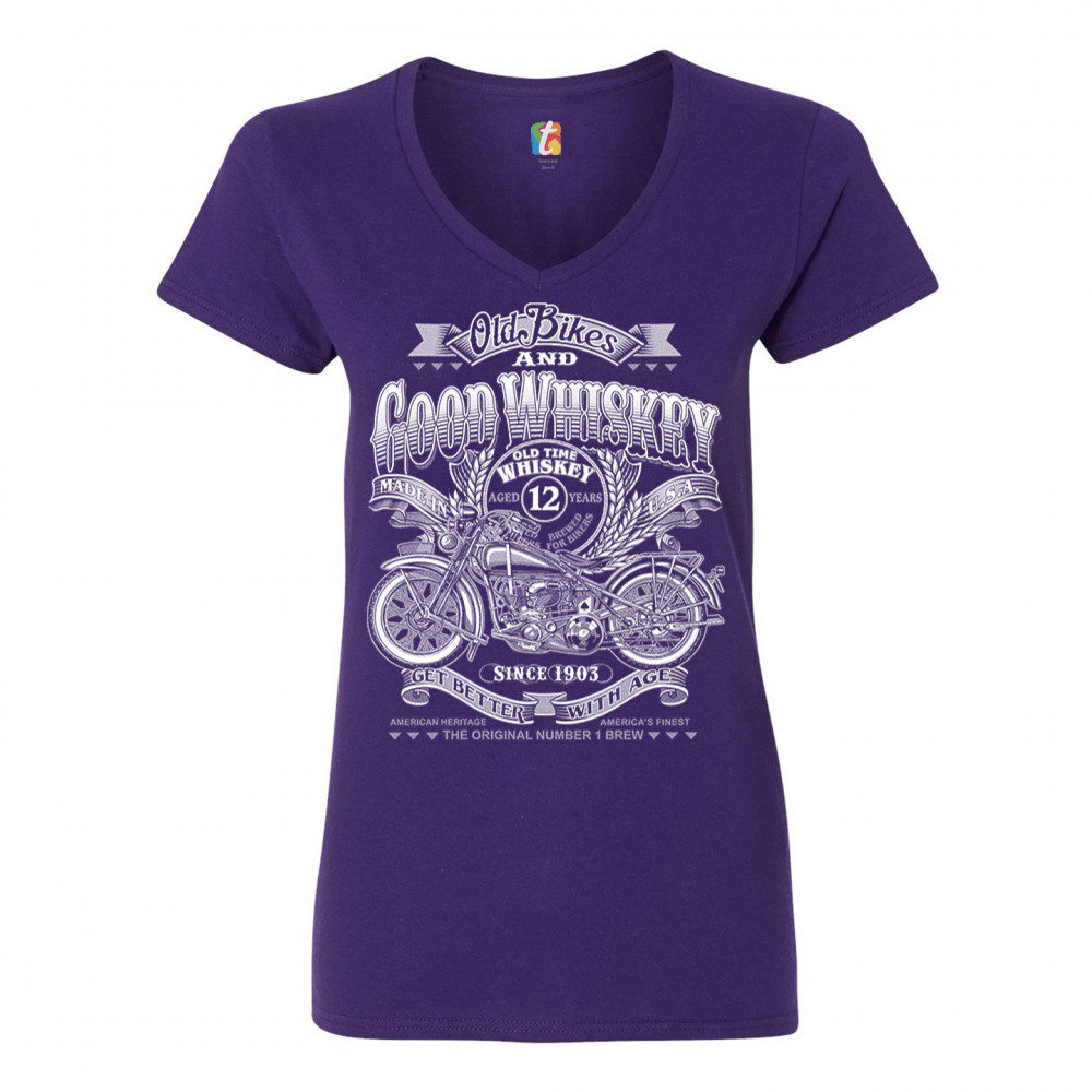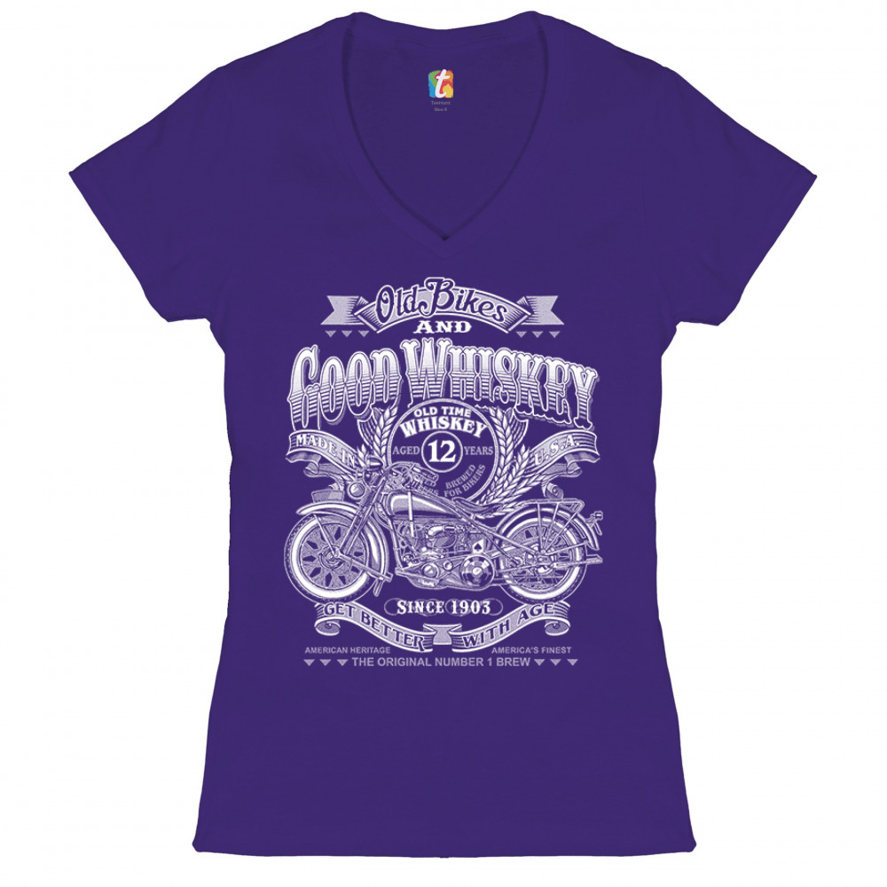 A print featuring a retro motorcycle. The print says: "Old bikes and good whiskey. Since 1903. Get better with age". In the center of the print there is a badge that says: "Old time whiskey, aged 12 years, brewed for bikers. Made in U.S.A". A great choice