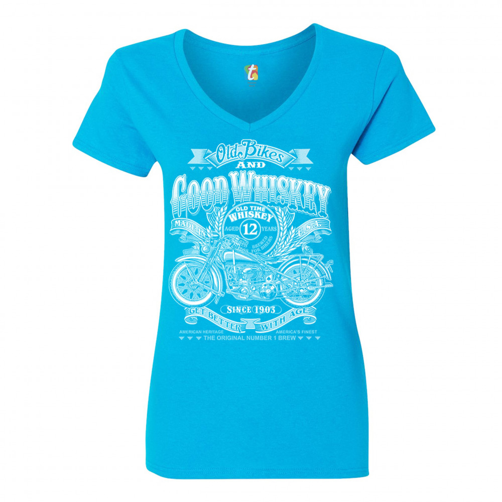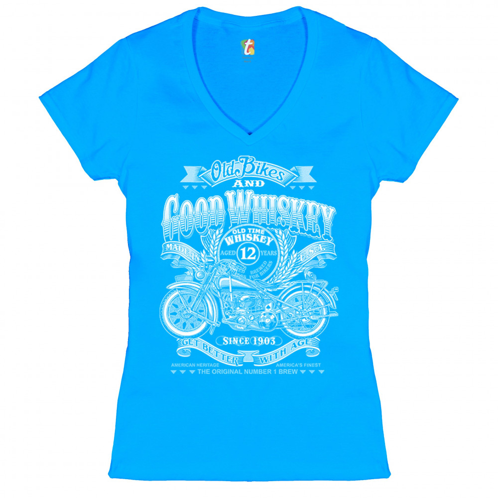 A print featuring a retro motorcycle. The print says: "Old bikes and good whiskey. Since 1903. Get better with age". In the center of the print there is a badge that says: "Old time whiskey, aged 12 years, brewed for bikers. Made in U.S.A". A great choice