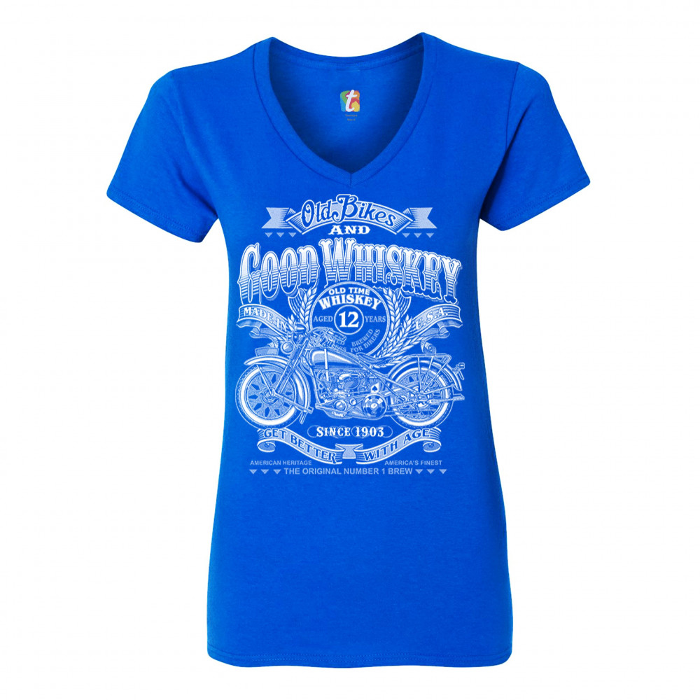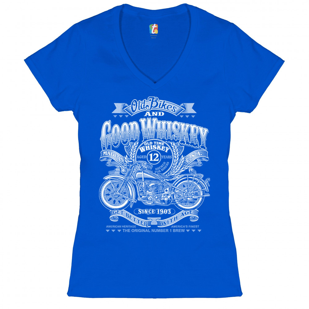 A print featuring a retro motorcycle. The print says: "Old bikes and good whiskey. Since 1903. Get better with age". In the center of the print there is a badge that says: "Old time whiskey, aged 12 years, brewed for bikers. Made in U.S.A". A great choice
