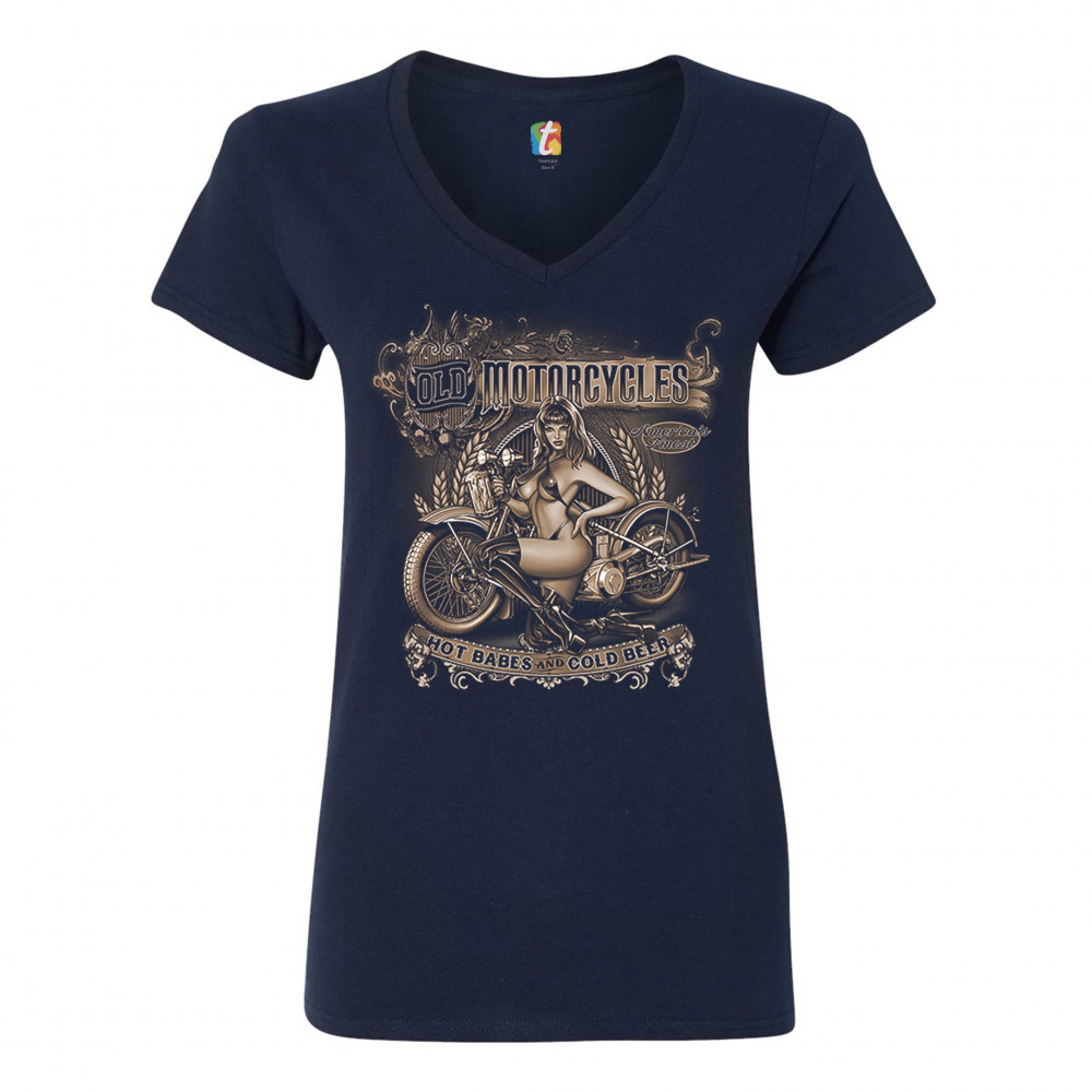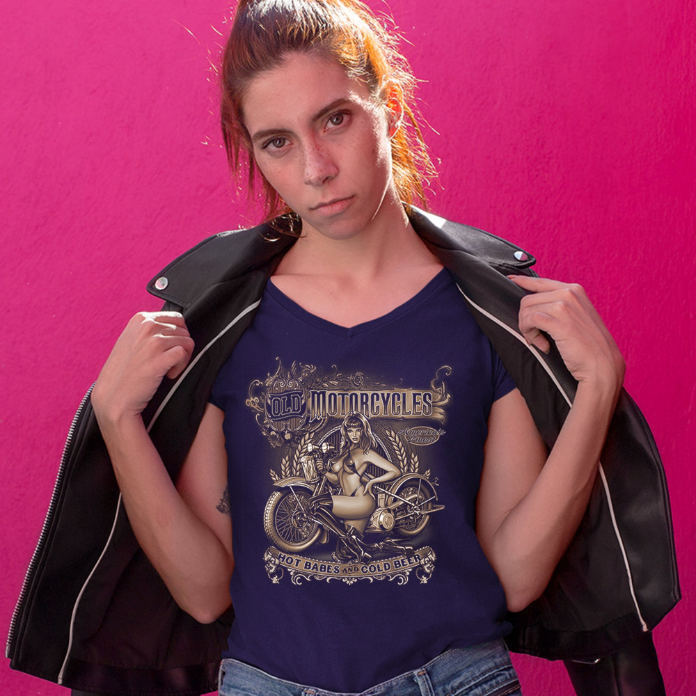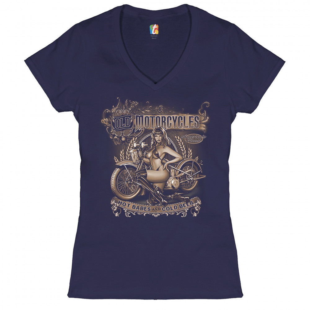 OLD MOTORCYCLES HOT BABES AND COLD BEER women's v-neck t-shirt biker babe tee navy blue