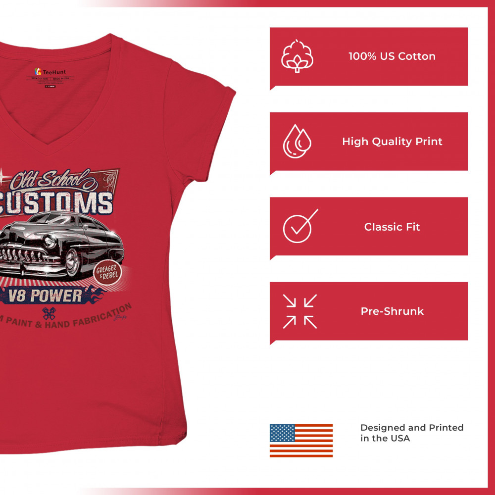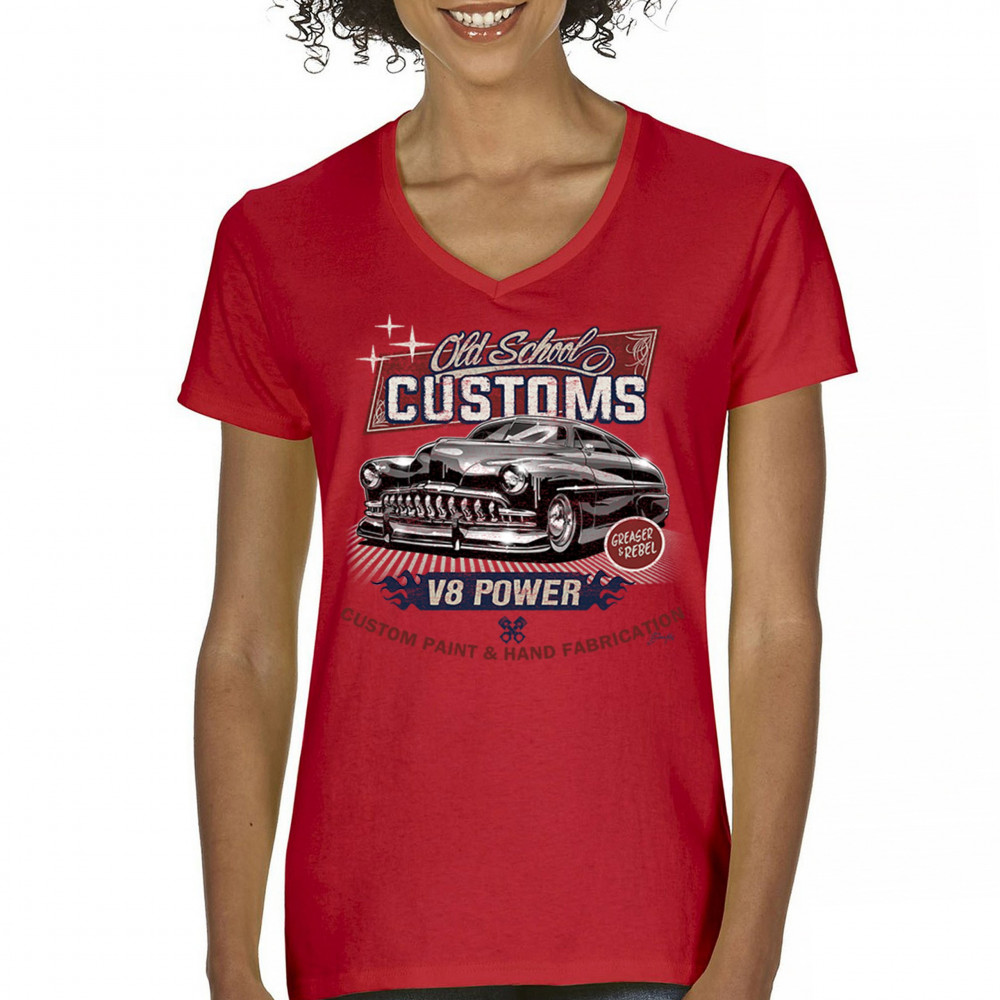 Celebrate classic automotive culture with our "Old School Customs" t-shirt, featuring a V8 power design. Perfect for car enthusiasts and fans of vintage rides.