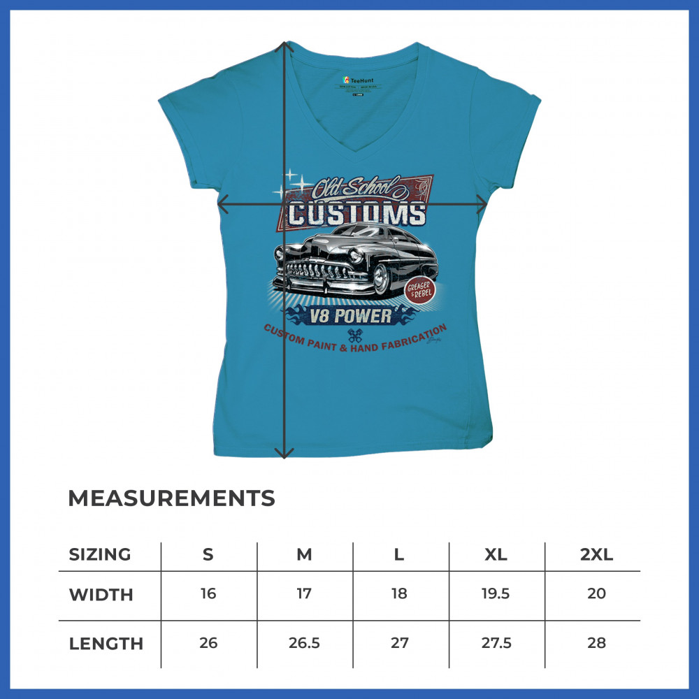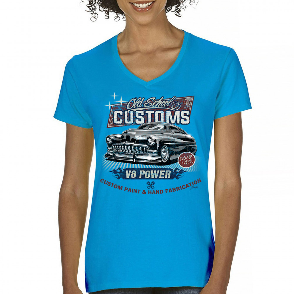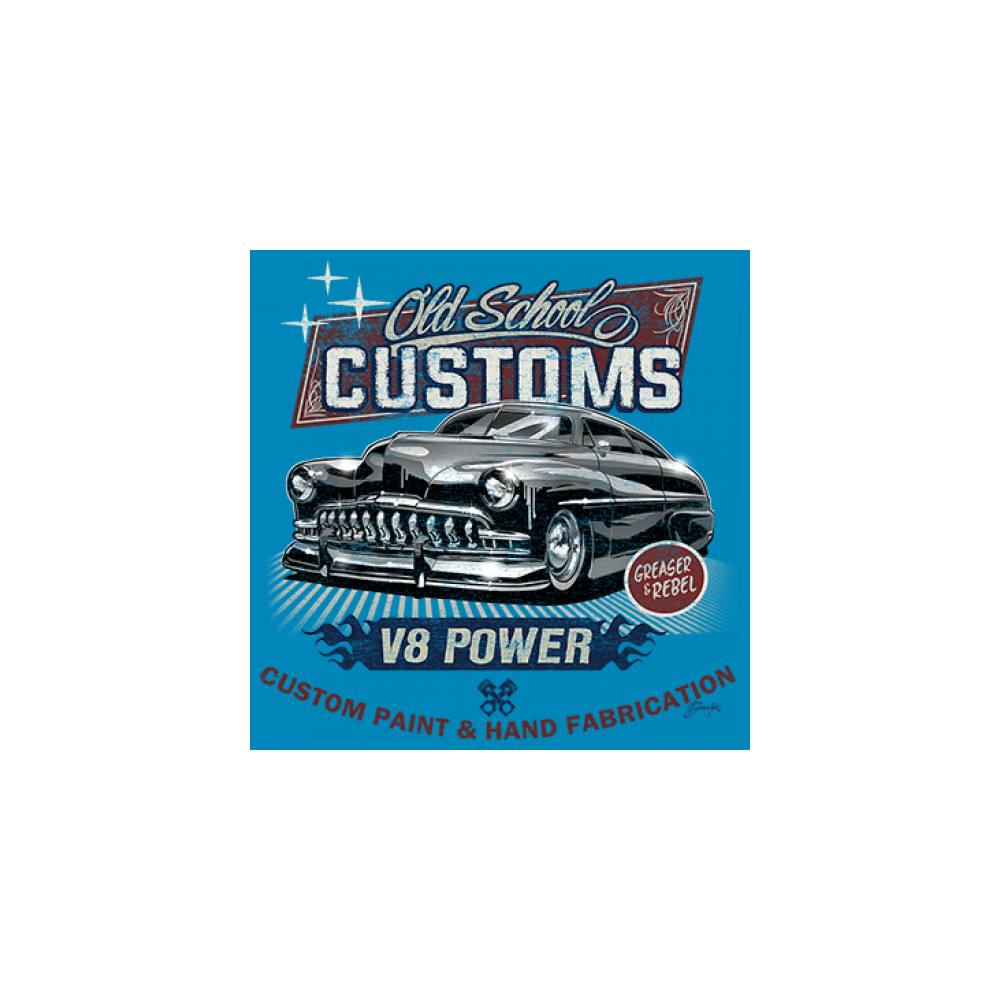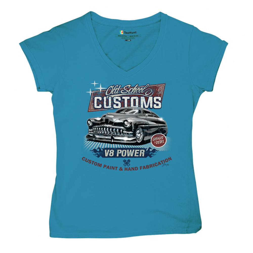Celebrate classic automotive culture with our "Old School Customs" t-shirt, featuring a V8 power design. Perfect for car enthusiasts and fans of vintage rides.