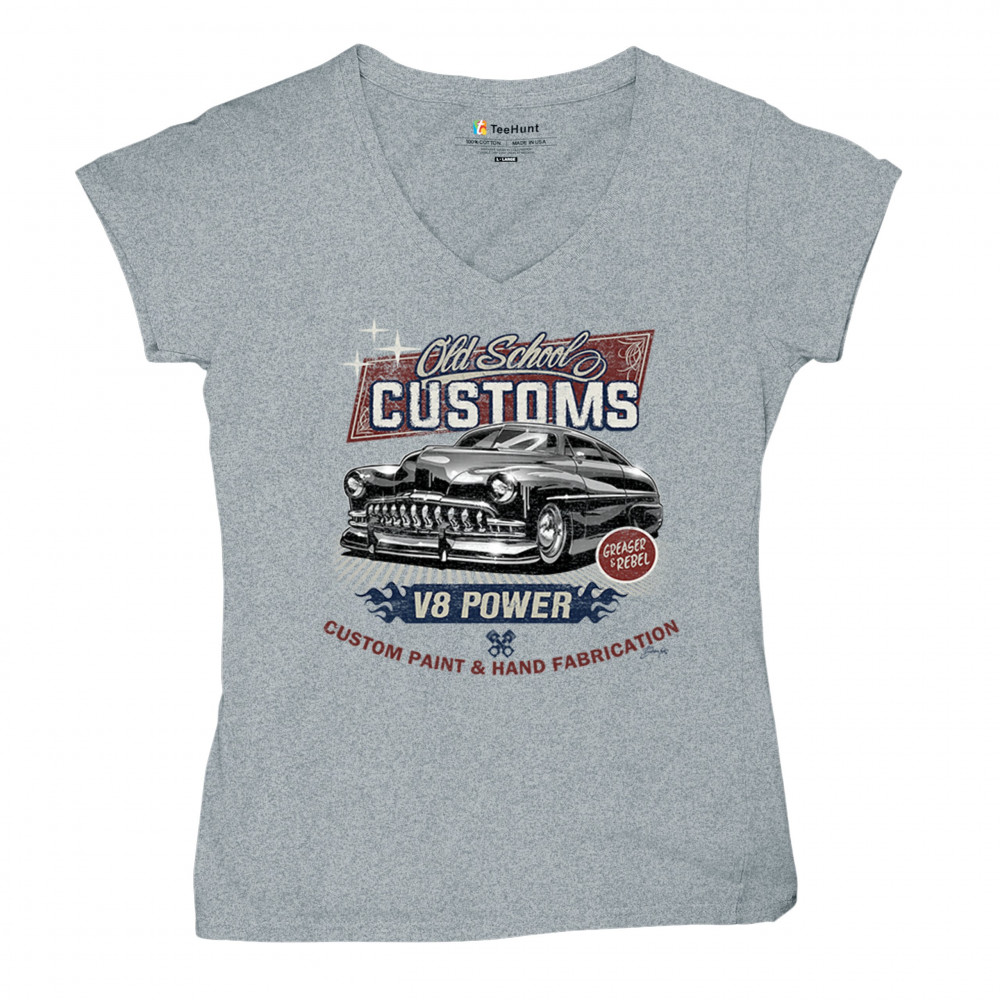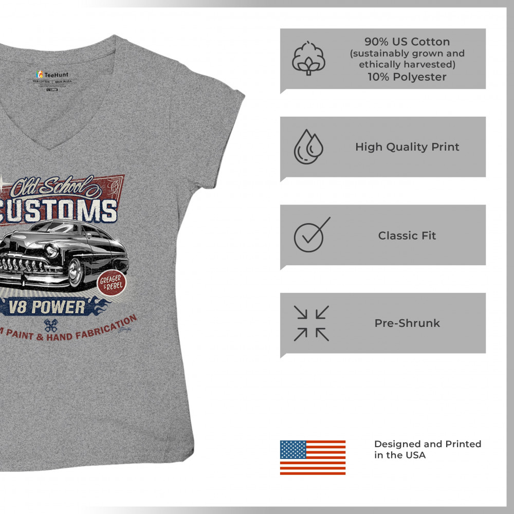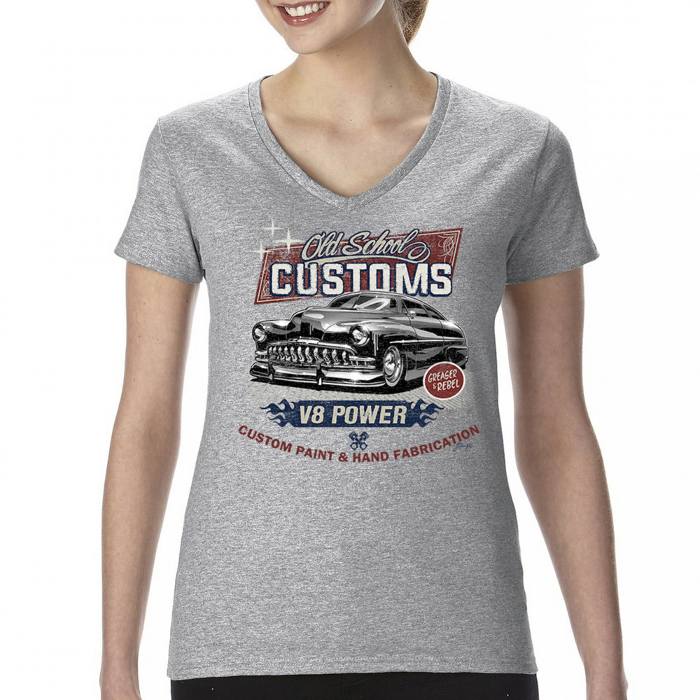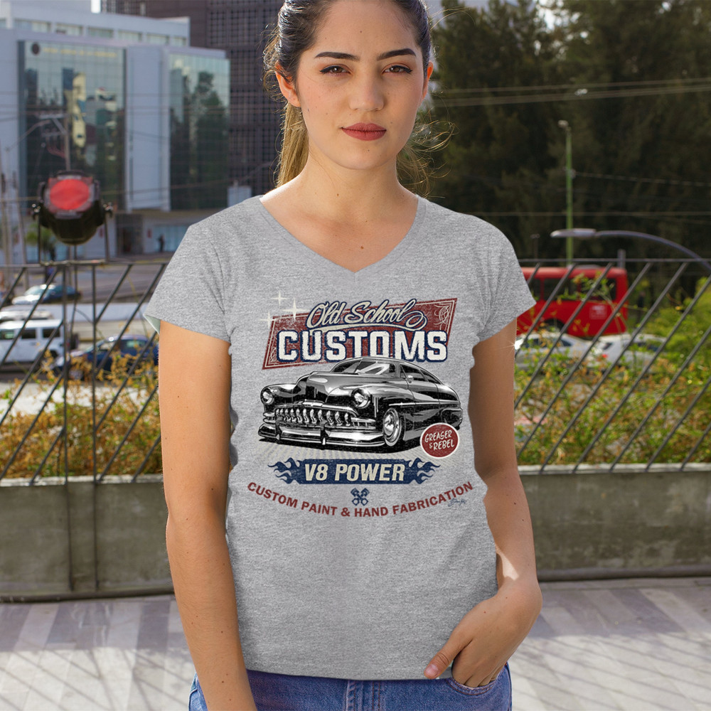 Celebrate classic automotive culture with our "Old School Customs" t-shirt, featuring a V8 power design. Perfect for car enthusiasts and fans of vintage rides.