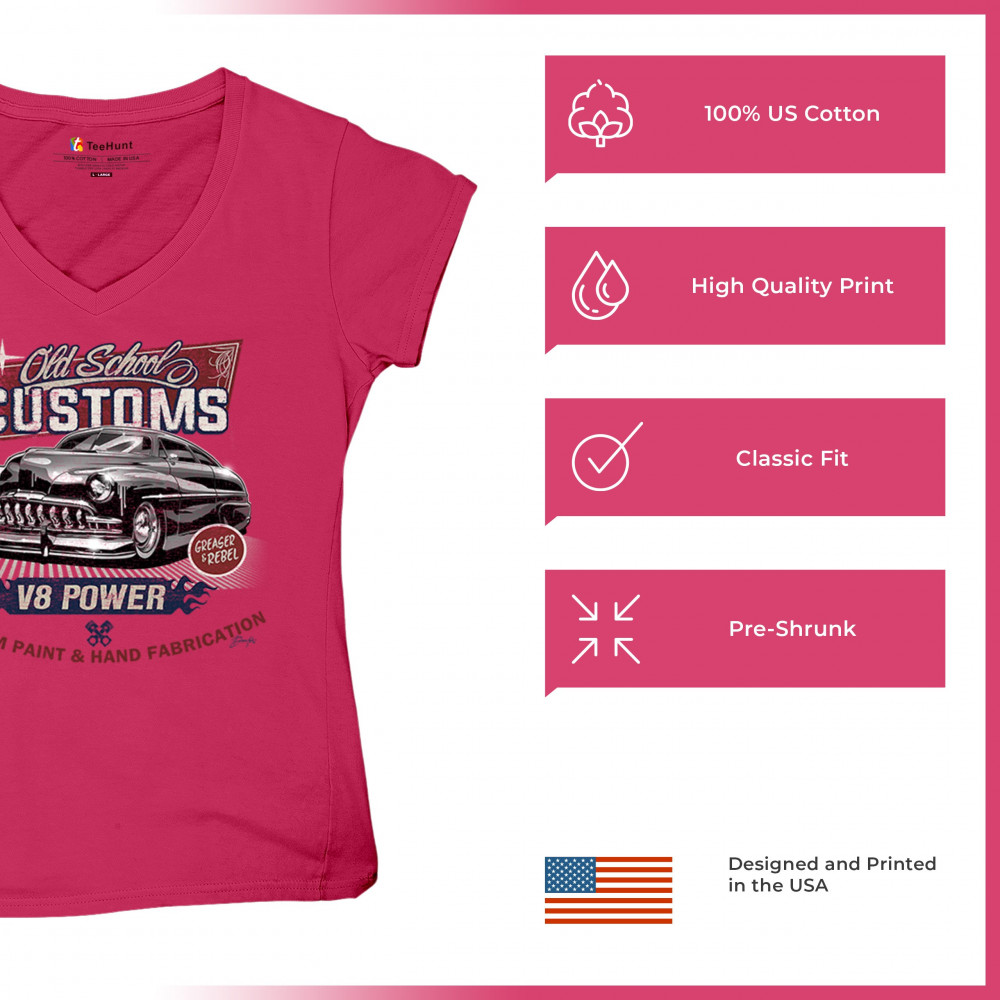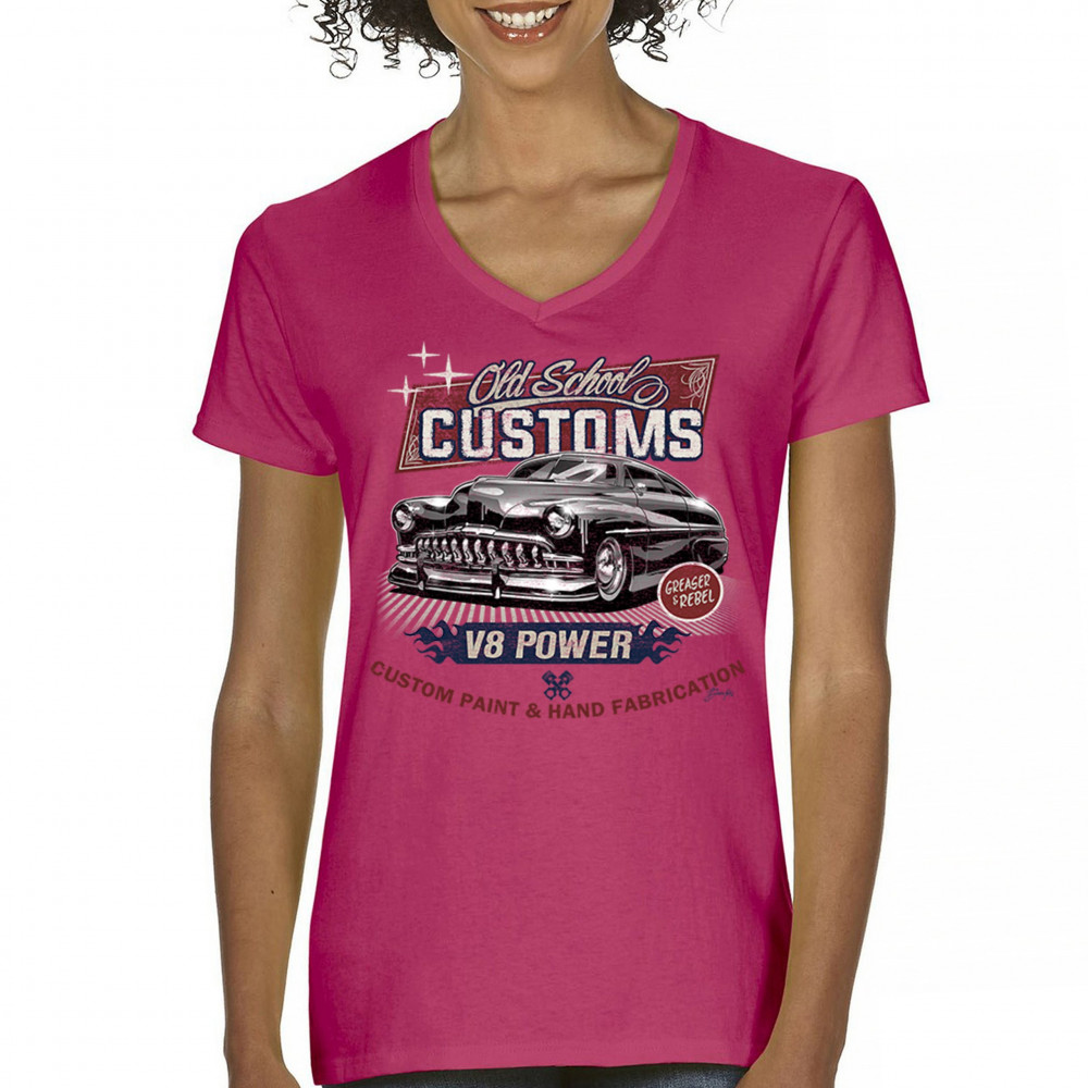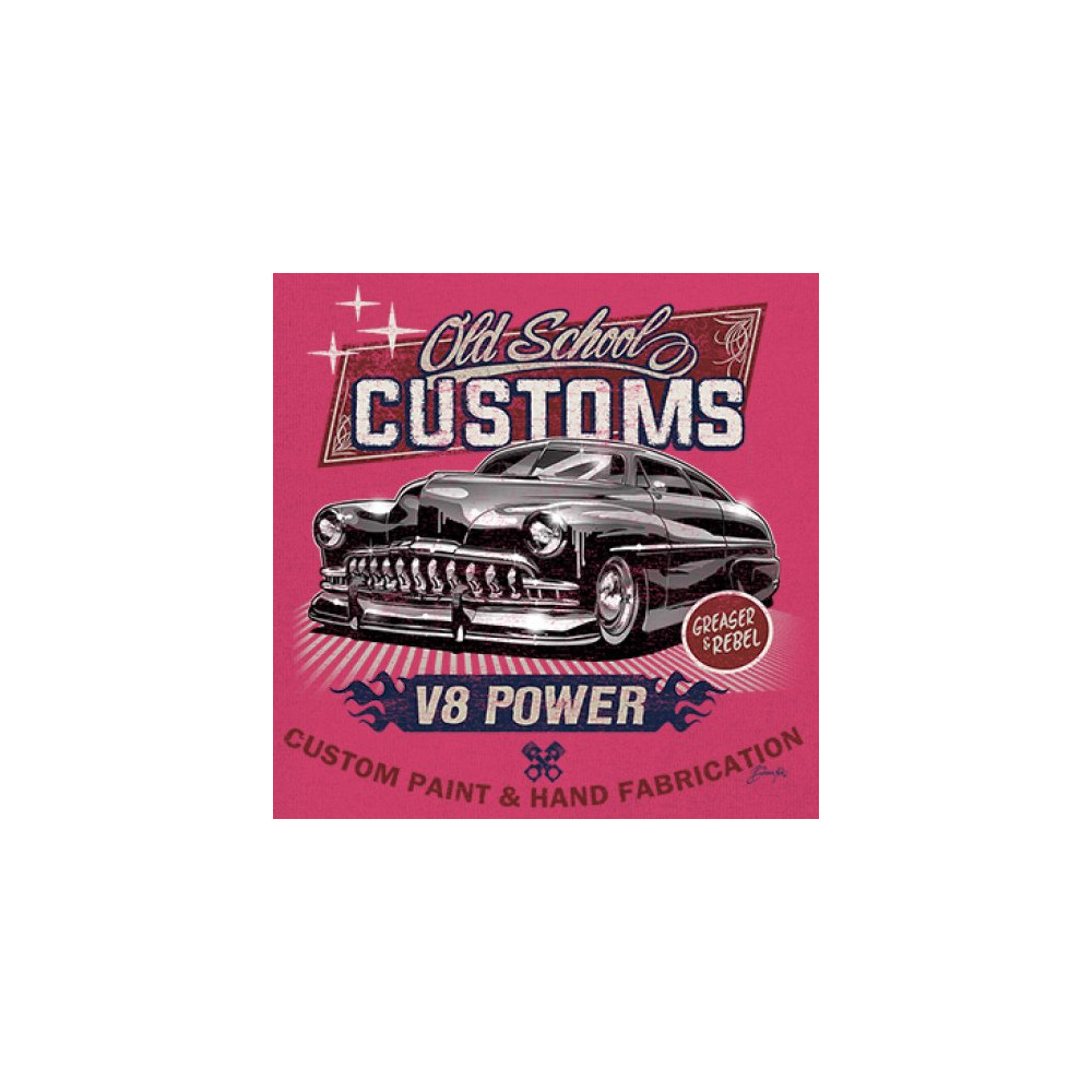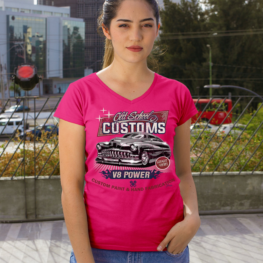 Celebrate classic automotive culture with our "Old School Customs" t-shirt, featuring a V8 power design. Perfect for car enthusiasts and fans of vintage rides.