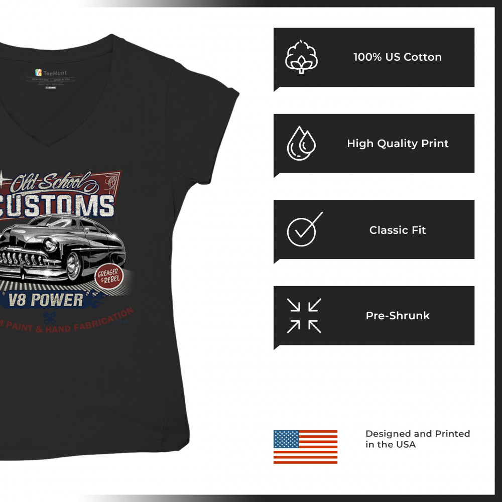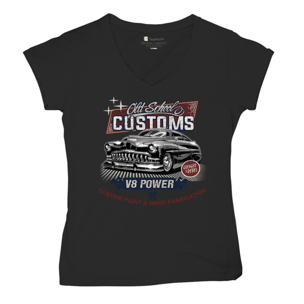 OLD SCHOOL CUSTOM V8 women's v-neck t-shirt hot rod greaser & rebel car tee black