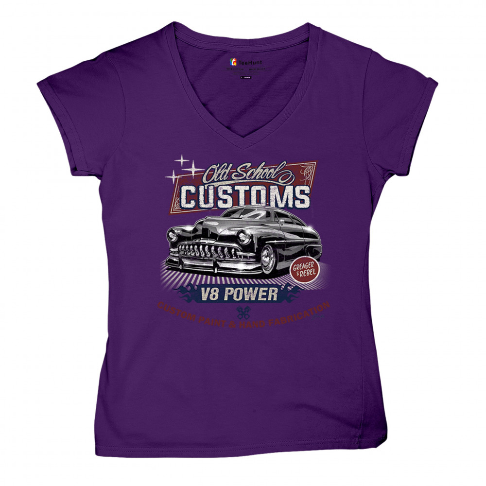 Celebrate classic automotive culture with our "Old School Customs" t-shirt, featuring a V8 power design. Perfect for car enthusiasts and fans of vintage rides.