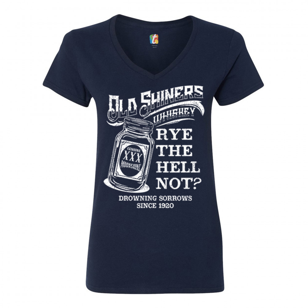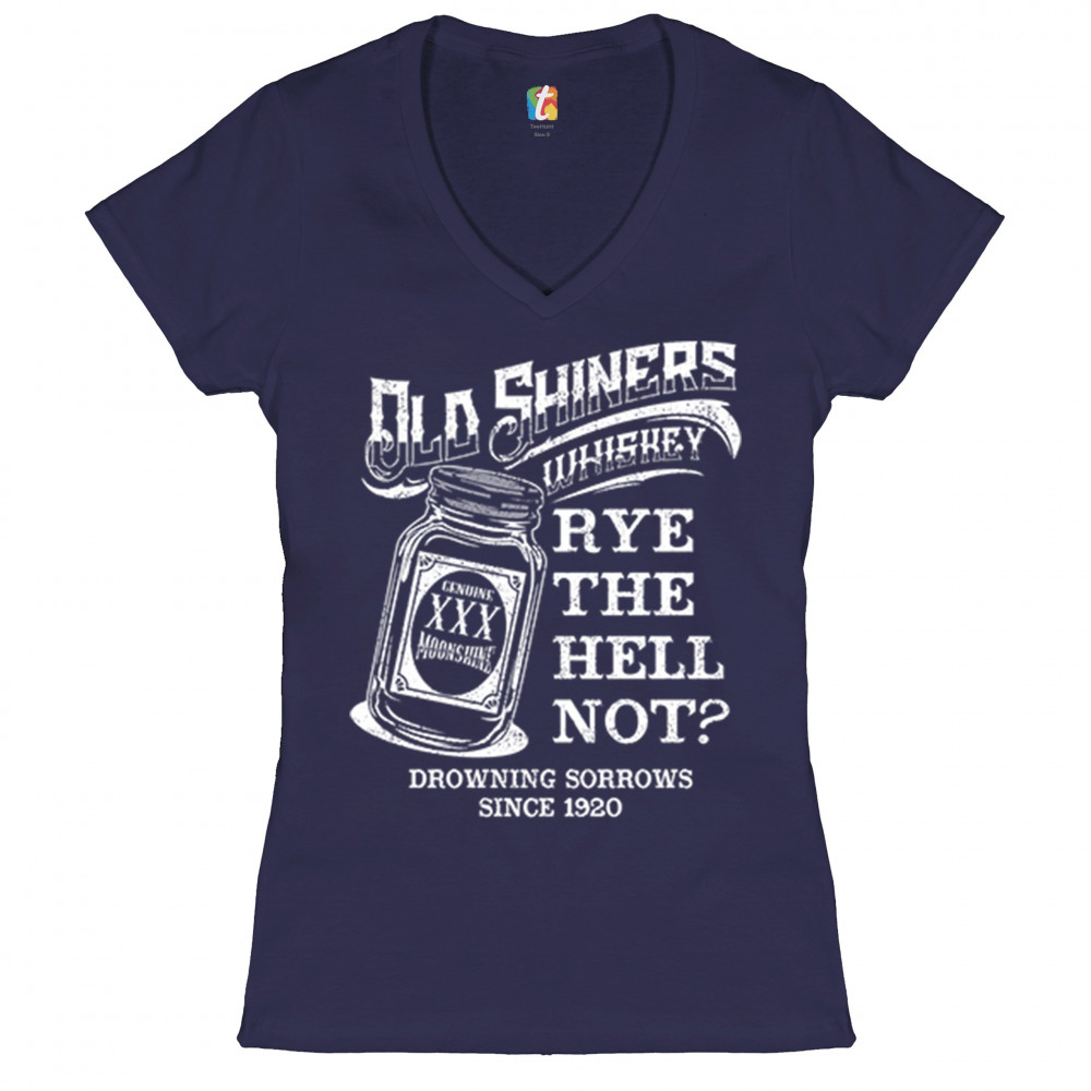 OLD SHINERS WHISKEY women's v-neck t-shirt rye the hell not? drinking tee navy blue