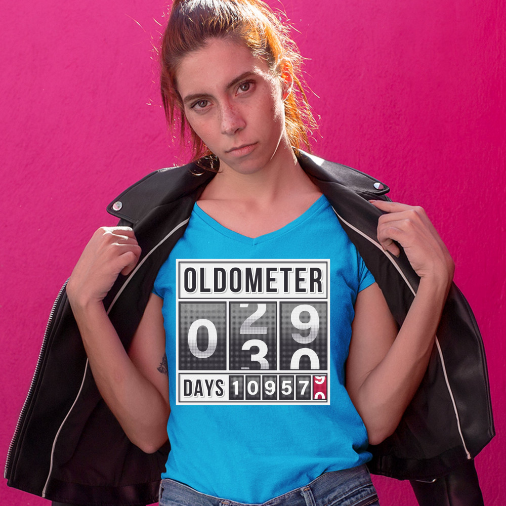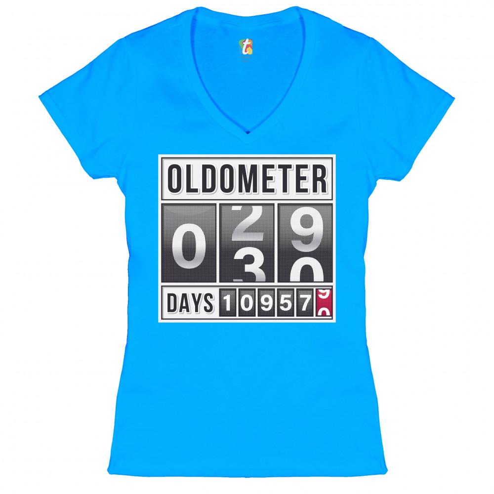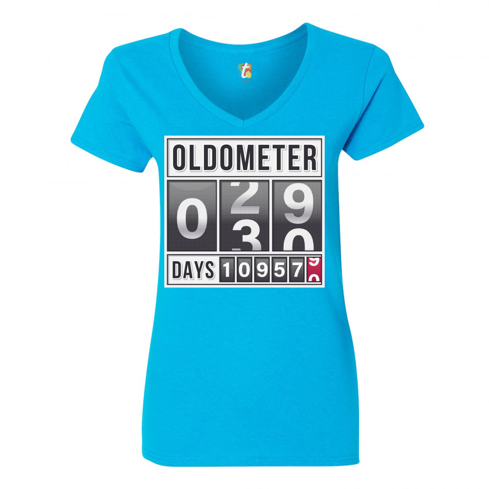 OLDOMETER 29-30 women's v-neck t-shirt funny odometer anniversary birthday tee turquoise