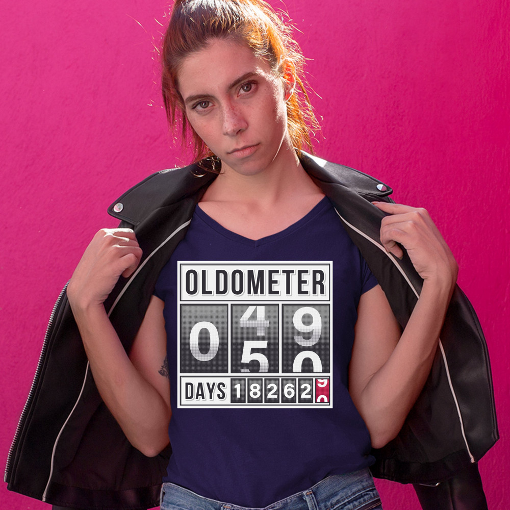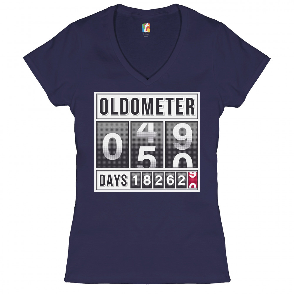 OLDOMETER 49-50 women's v-neck t-shirt 50th anniversary 50 af odometer tee navy blue