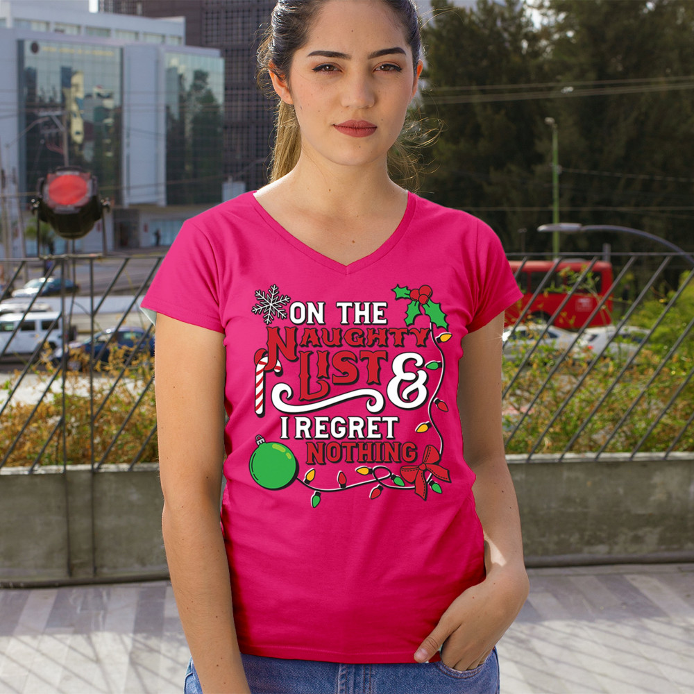 Celebrate the holidays with the playful “Naughty List & I Regret Nothing†design. Perfect for festive gatherings, ugly sweater parties, and holiday fun!