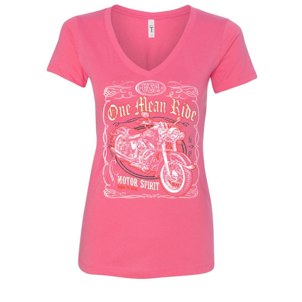ONE MEAN RIDE women's v-neck t-shirt born to ride chopper bobber route 66 biker pink