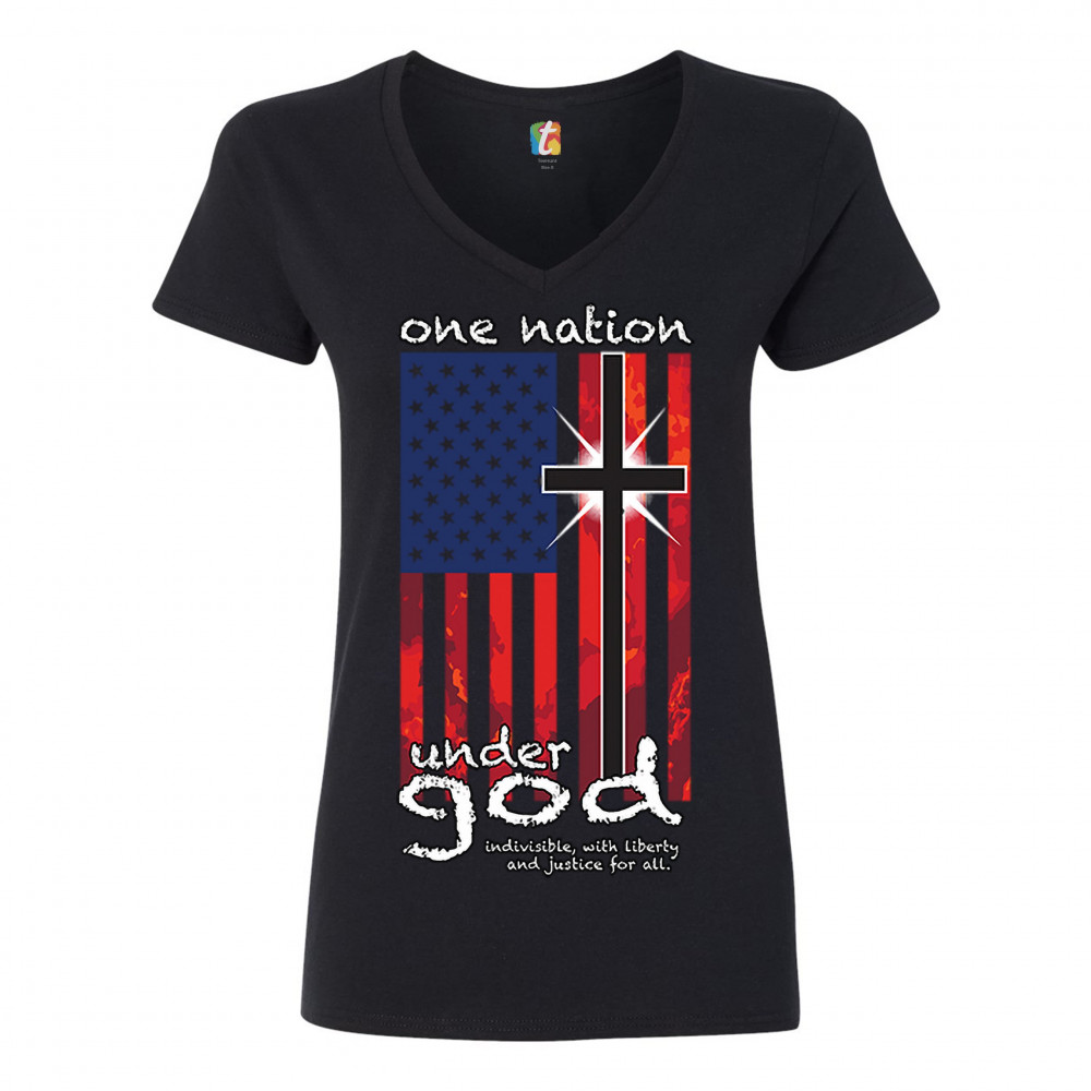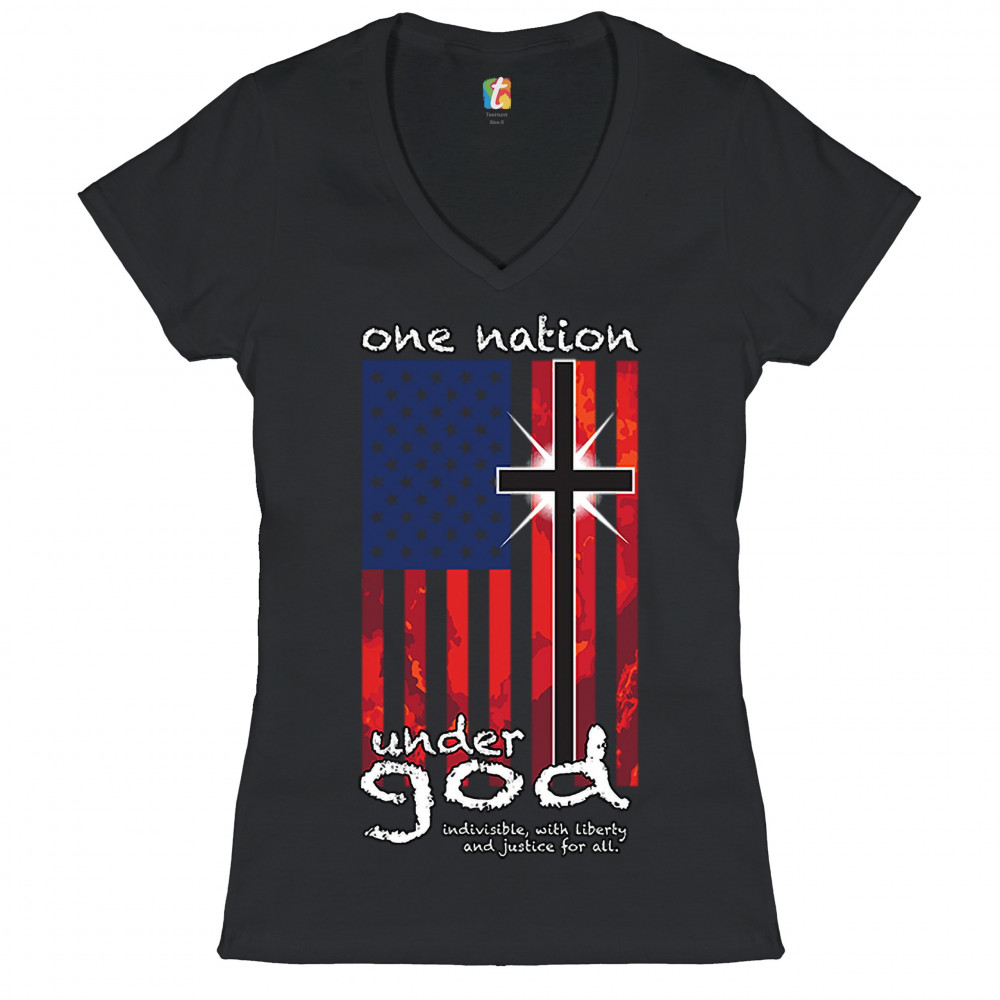 A patriotic print saying "One Nation Under God Indivisible, with Liberty and Justice for All" and featuring an American Flag with a cross instead of one of the stripes. Great choice for a religious person to wear on Independence Day or any other patriotic