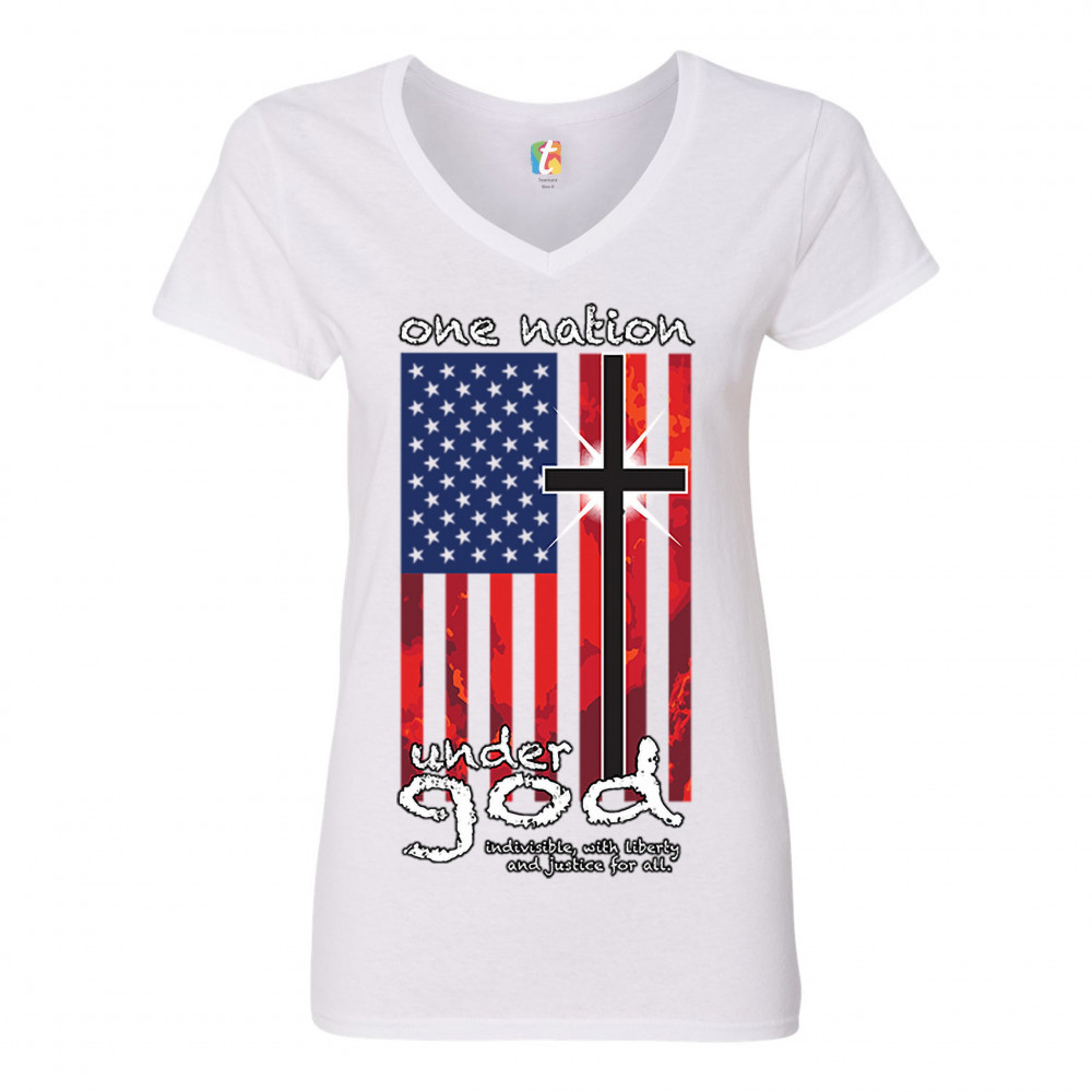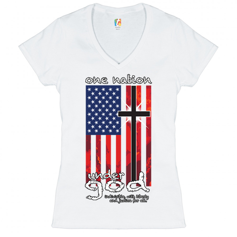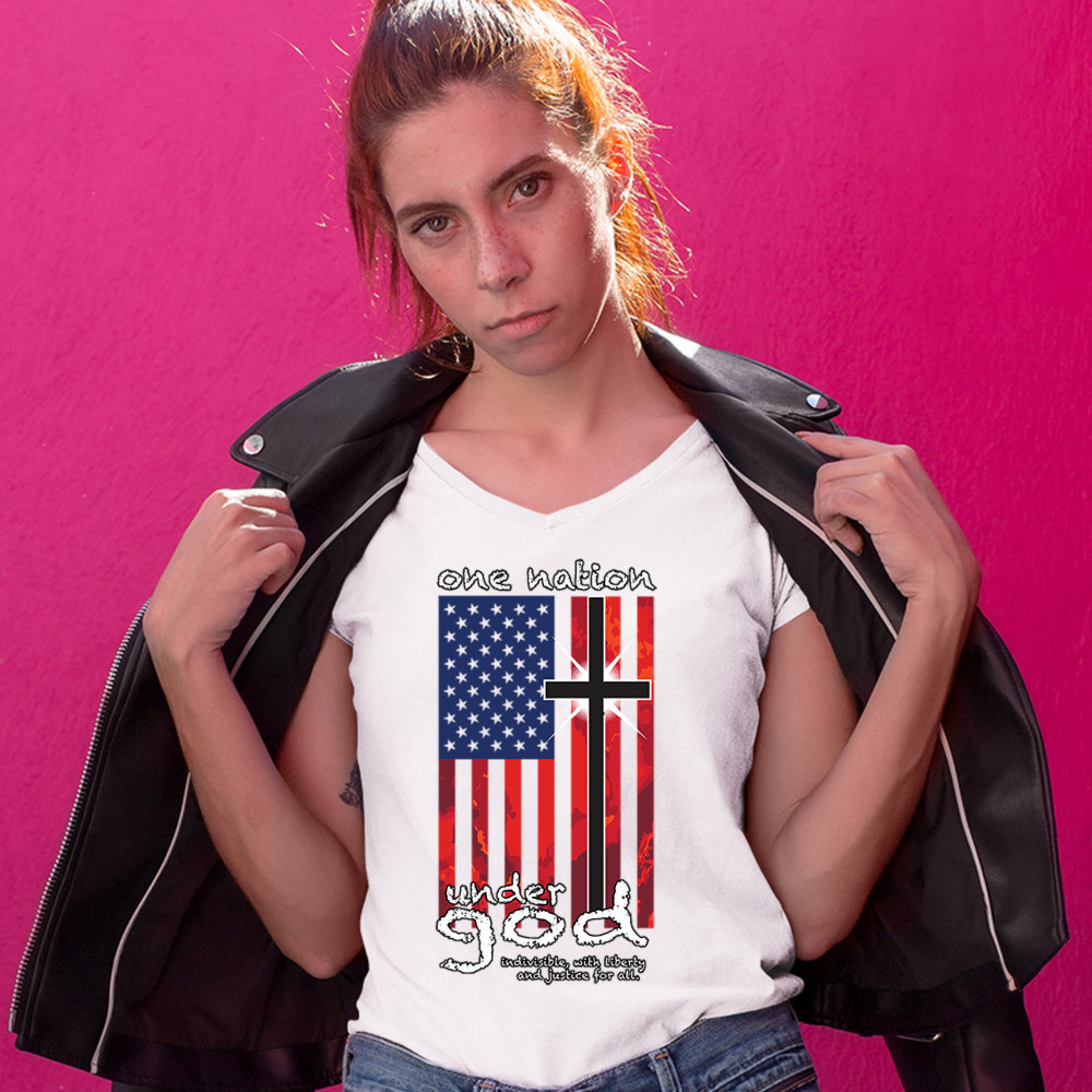 A patriotic print saying "One Nation Under God Indivisible, with Liberty and Justice for All" and featuring an American Flag with a cross instead of one of the stripes. Great choice for a religious person to wear on Independence Day or any other patriotic