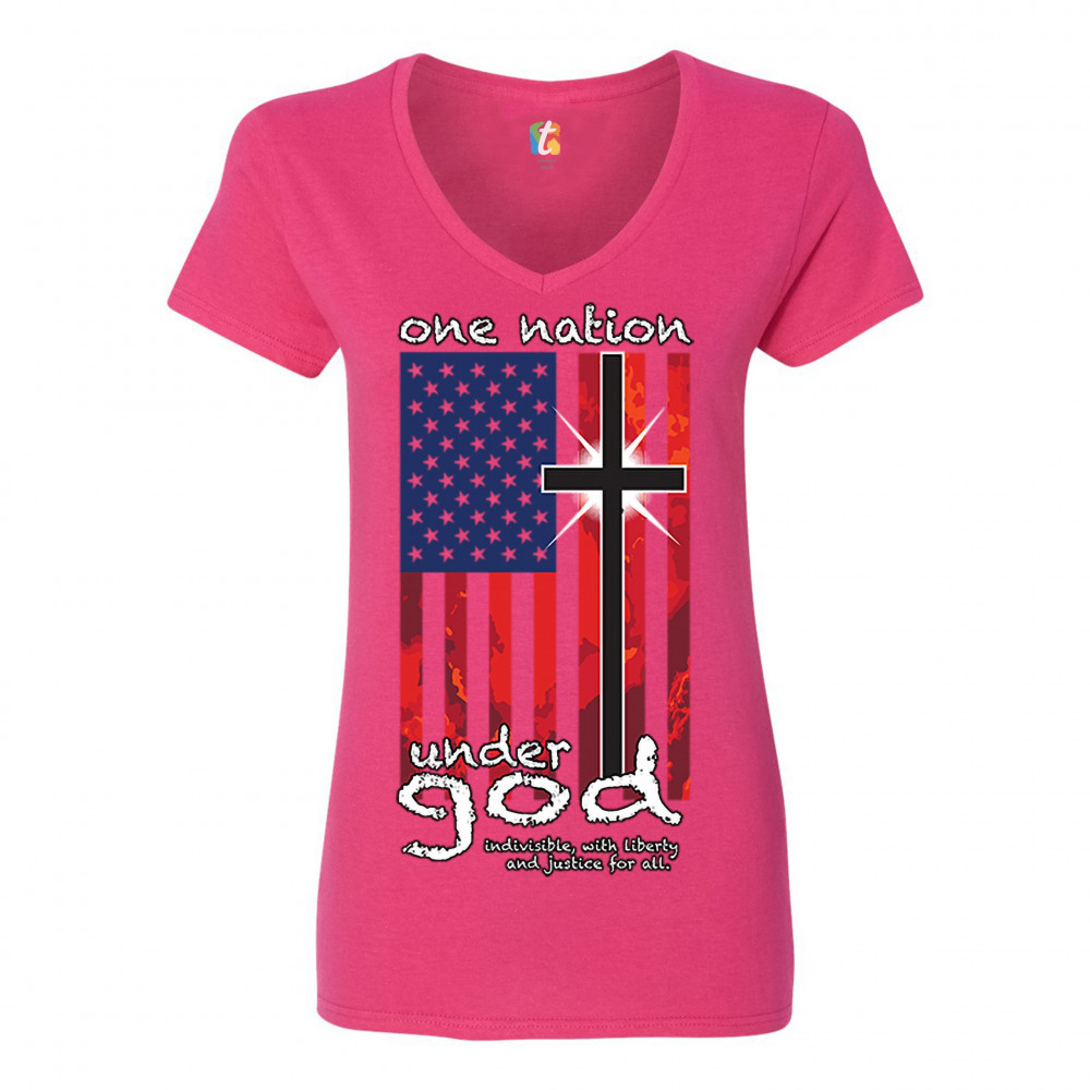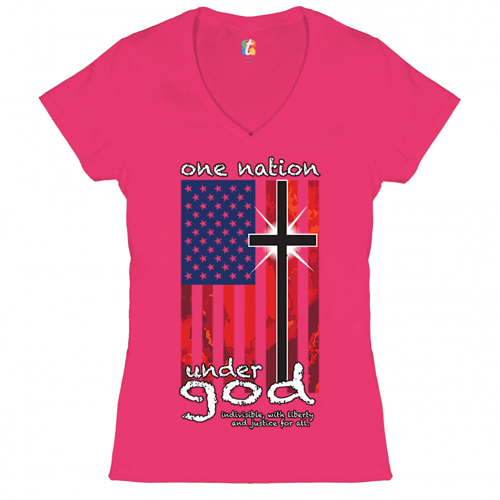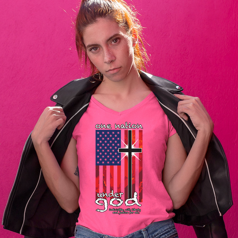 A patriotic print saying "One Nation Under God Indivisible, with Liberty and Justice for All" and featuring an American Flag with a cross instead of one of the stripes. Great choice for a religious person to wear on Independence Day or any other patriotic