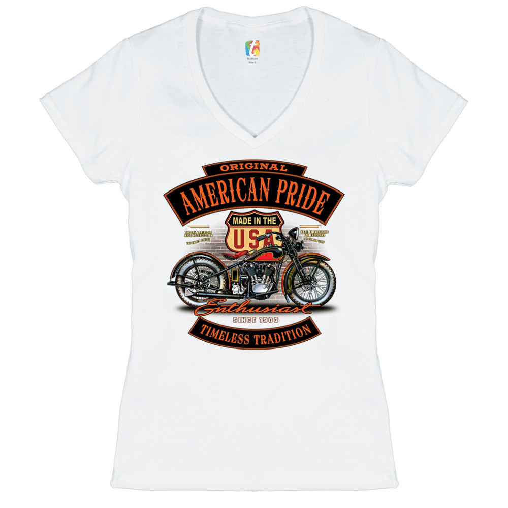 ORIGINAL AMERICAN PRIDE women's v-neck t-shirt biker motorcycle enthusiast tee white