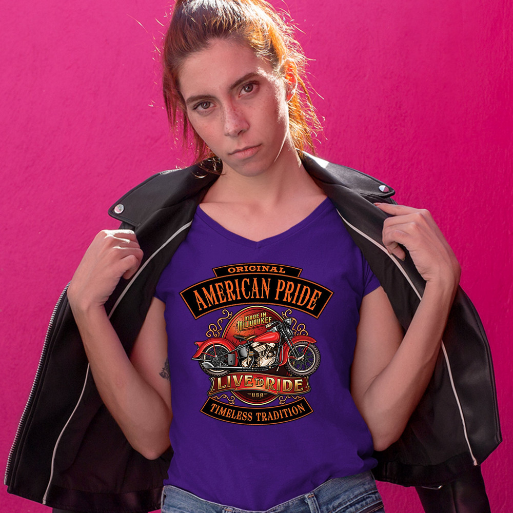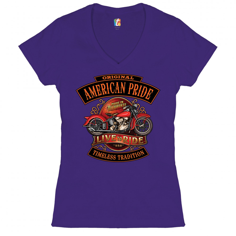 ORIGINAL AMERICAN PRIDE women's v-neck t-shirt live to ride motorcycle tee purple