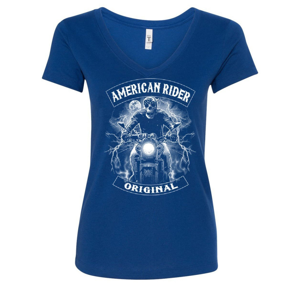 ORIGINAL AMERICAN RIDER women's v-neck t-shirt skull face route 66 biker mc royal blue