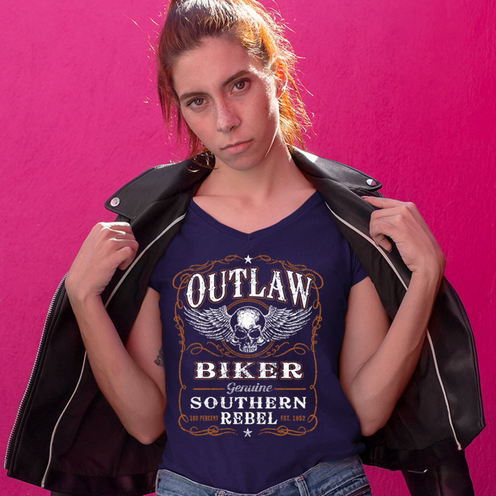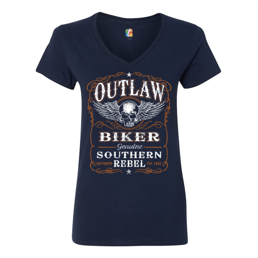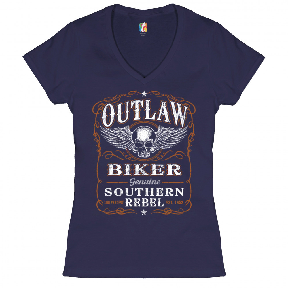 OUTLAW BIKER women's v-neck t-shirt genuine southern rebel winged skull tee navy blue