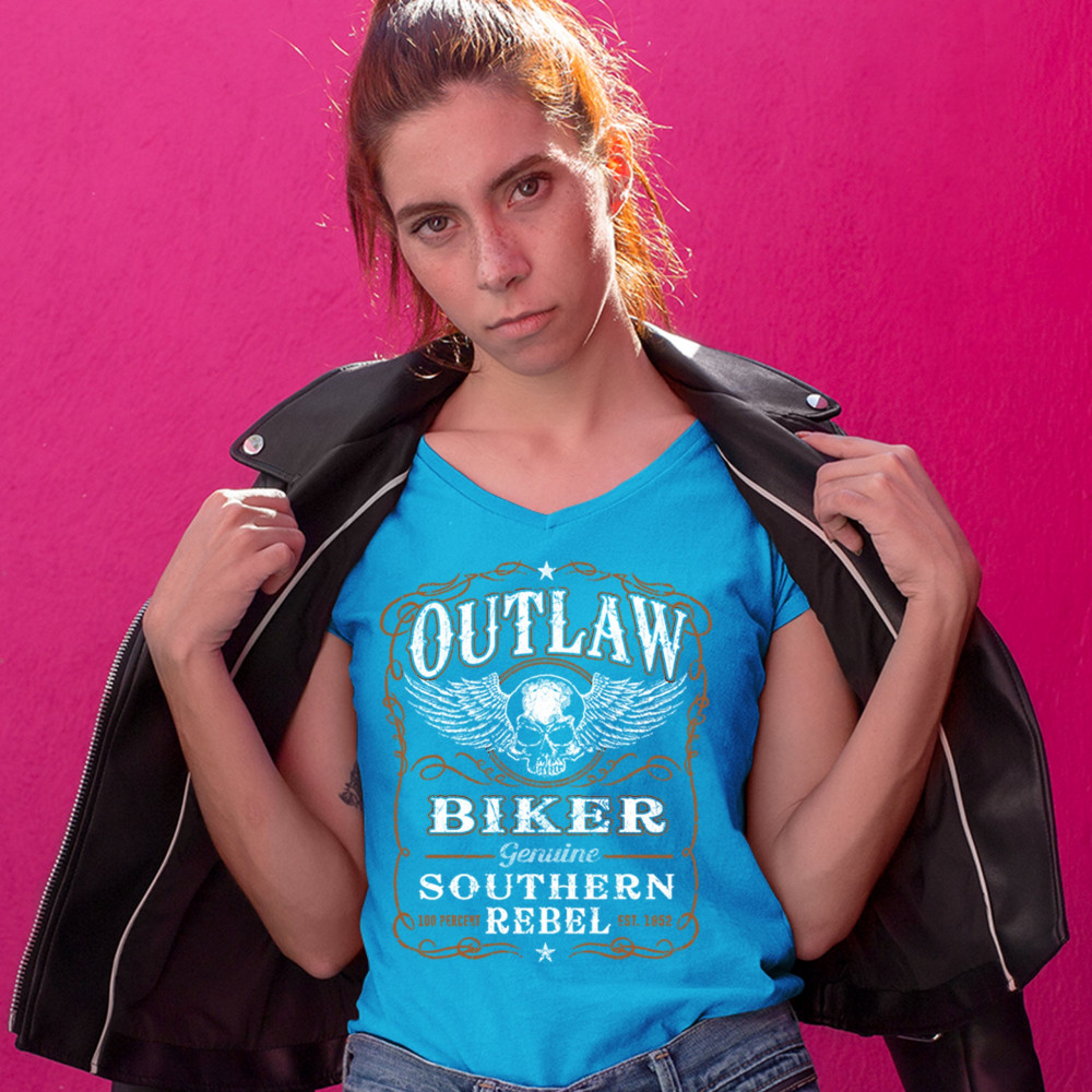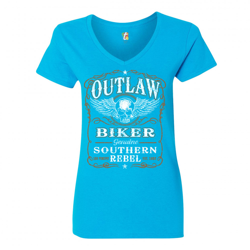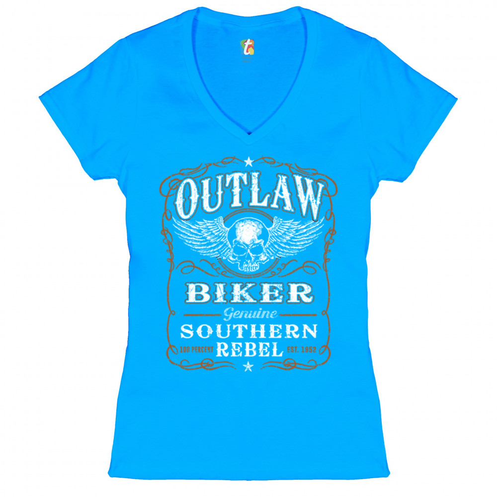 OUTLAW BIKER women's v-neck t-shirt genuine southern rebel winged skull tee turquoise