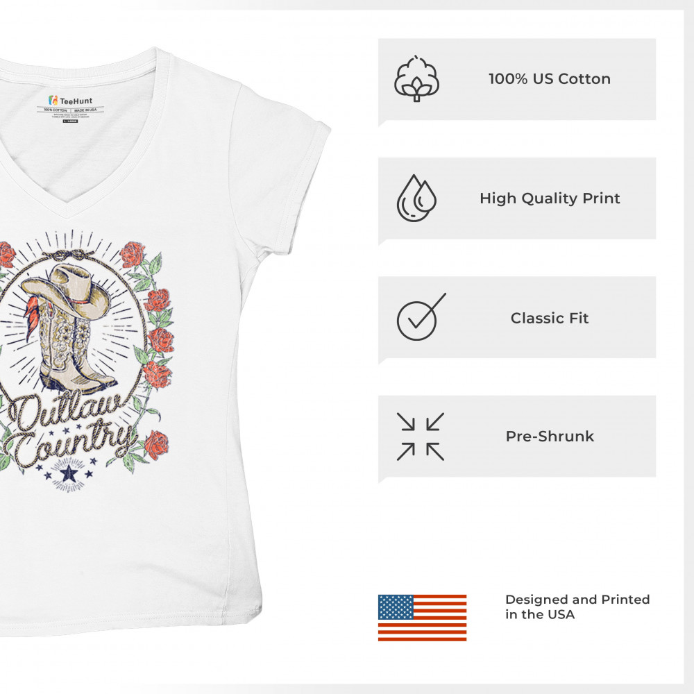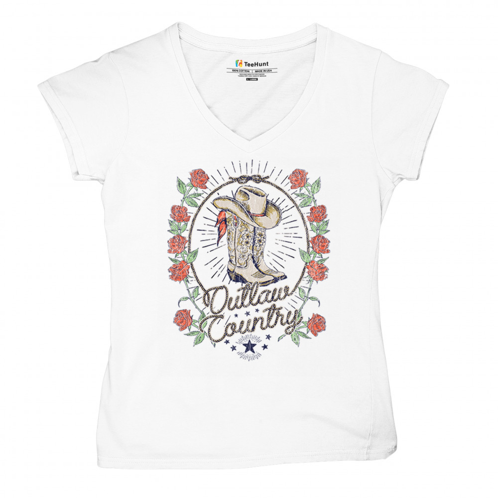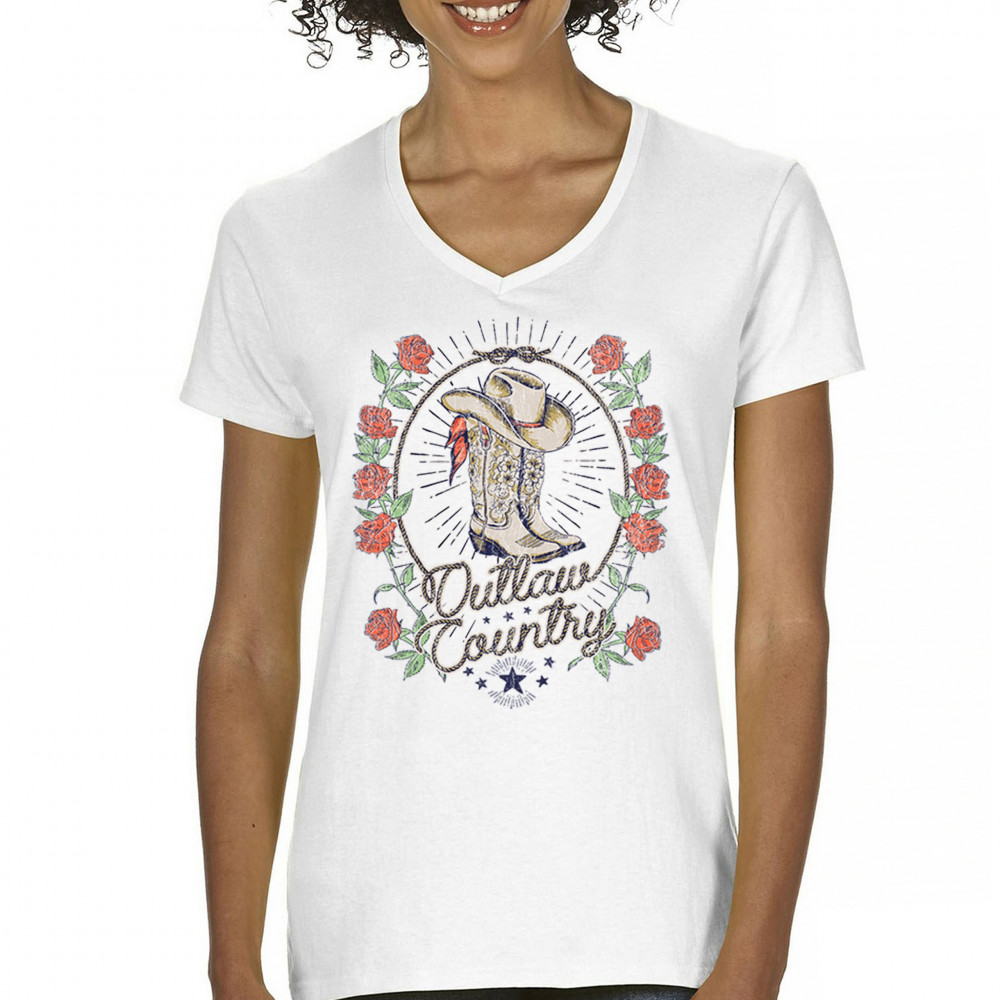 Outlaw country design with cowgirl boots, hat, and roses. Bold feminine western style for concerts, rodeos, and southern lifestyle lovers.