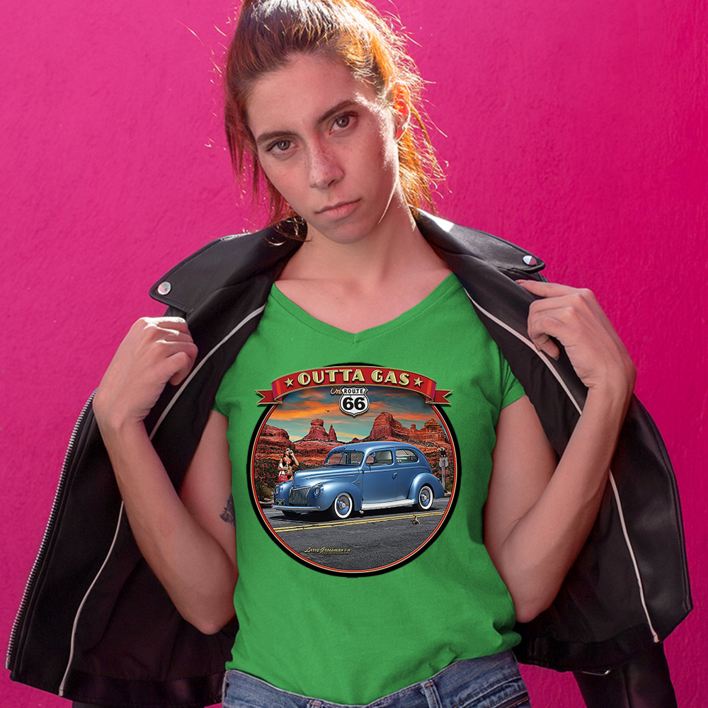 OUTTA GAS ON ROUTE 66 women's v-neck t-shirt the mother road retro vintage tee green