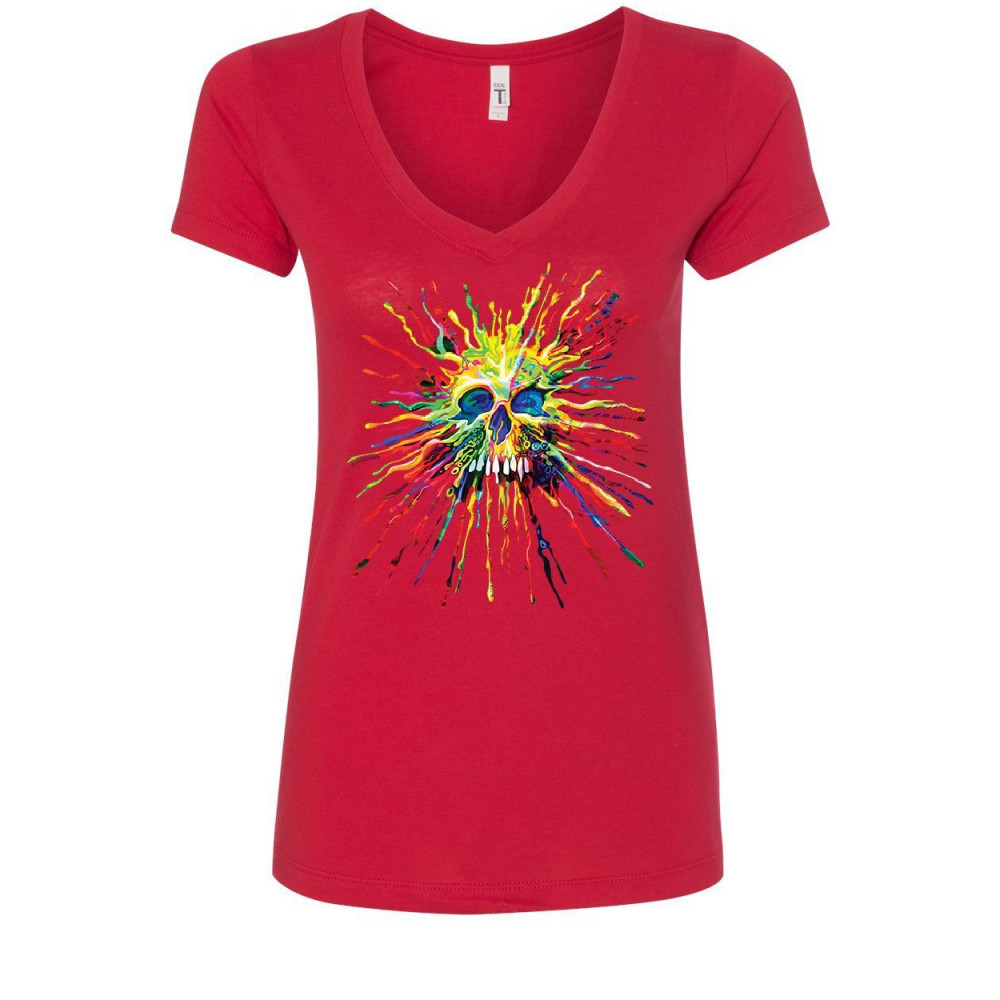 PAINT SPLATTER SKULL women's v-neck t-shirt multicolor art crazy melting drip red