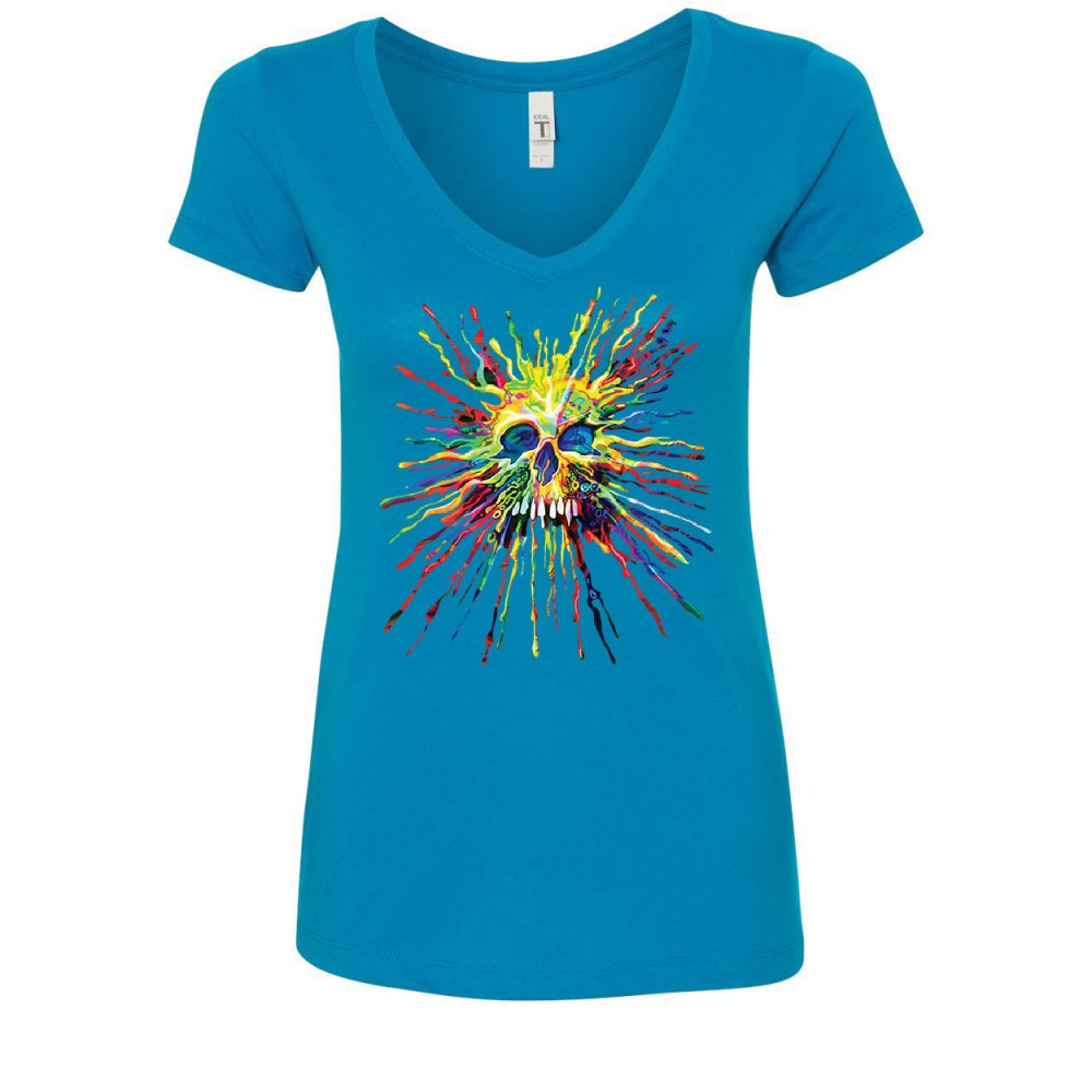PAINT SPLATTER SKULL women's v-neck t-shirt multicolor art crazy melting drip turquoise