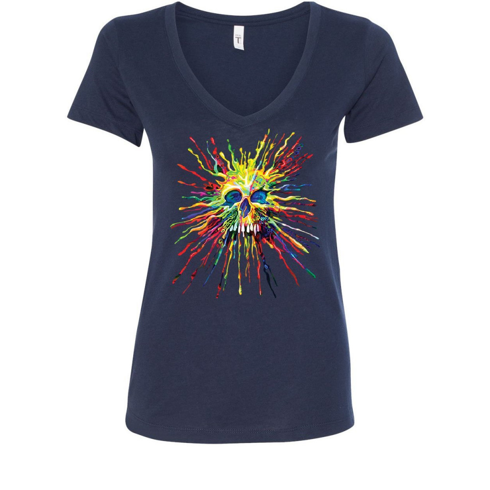PAINT SPLATTER SKULL women's v-neck t-shirt multicolor art crazy melting drip navy blue
