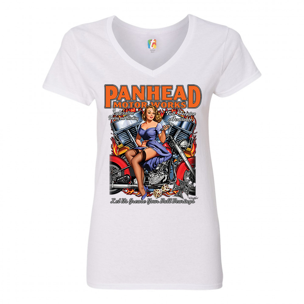 A print featuring a sexy pin-up girl sitting on a chopper motorcycle holding a wrench. In the background there is a V-engine. The print says: "Panhead motor works, Lubrication boring and stroking, Full service available, Let us grease your ball bearings".
