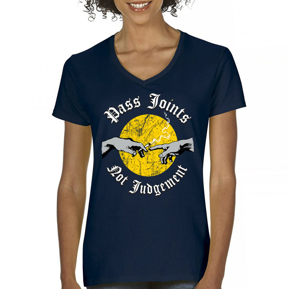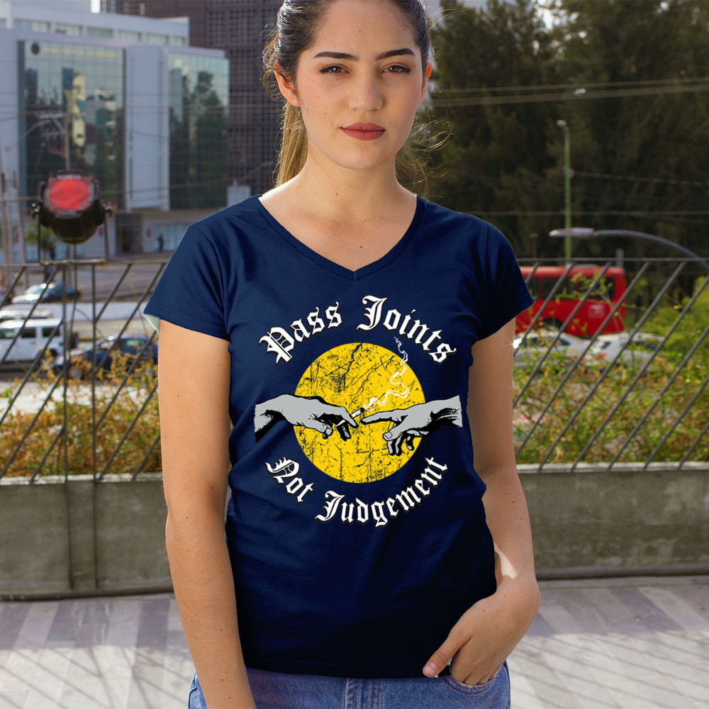 Cannabis culture twist on classic art. Hands passing a joint with “Pass Joints Not Judgement†message. Chill, bold, and unapologetically stoner.