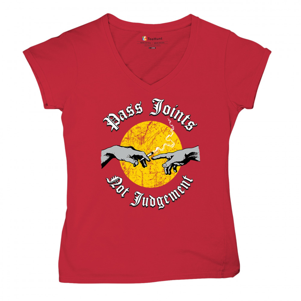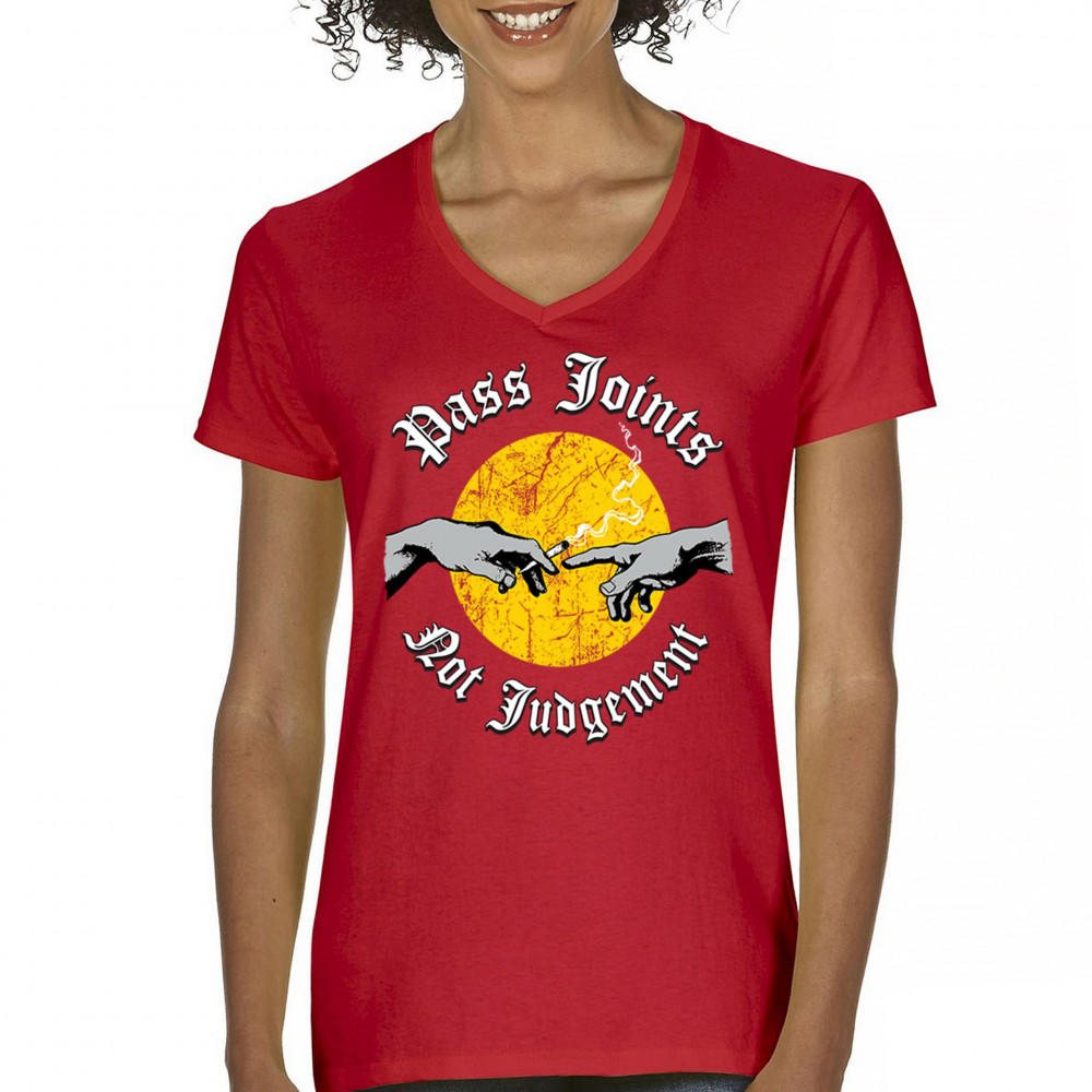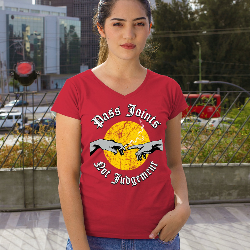 Cannabis culture twist on classic art. Hands passing a joint with “Pass Joints Not Judgement†message. Chill, bold, and unapologetically stoner.