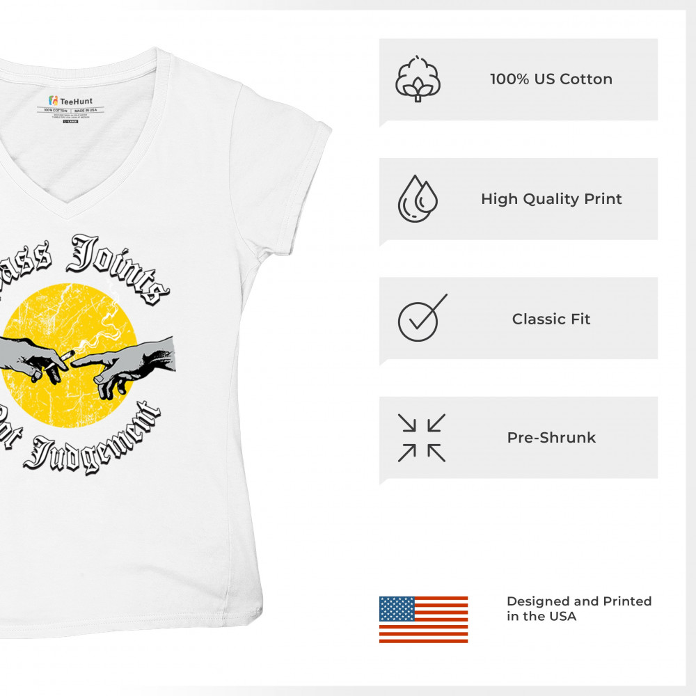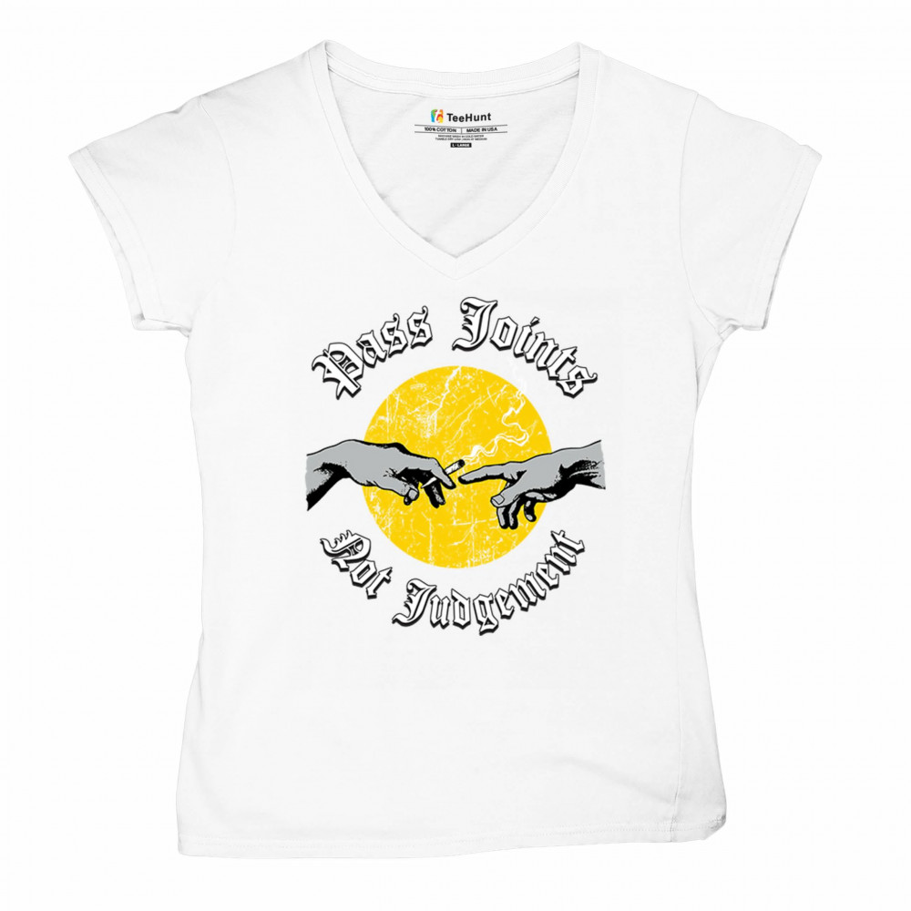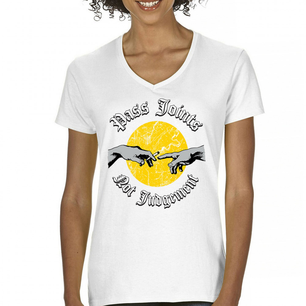 Cannabis culture twist on classic art. Hands passing a joint with “Pass Joints Not Judgement†message. Chill, bold, and unapologetically stoner.
