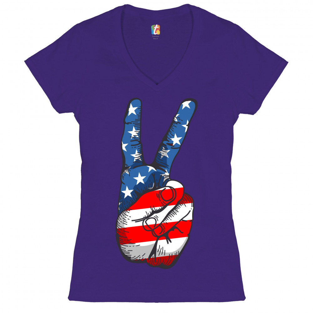 PATRIOTIC VICTORY SIGN women's v-neck t-shirt american flag 4th of july tee purple