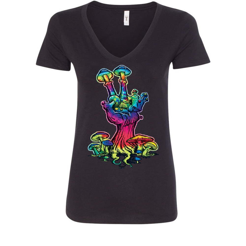 MUSHROOM PEACE peace mushroom women's v-neck t-shirt shroom hippie fungi colorful neon love black