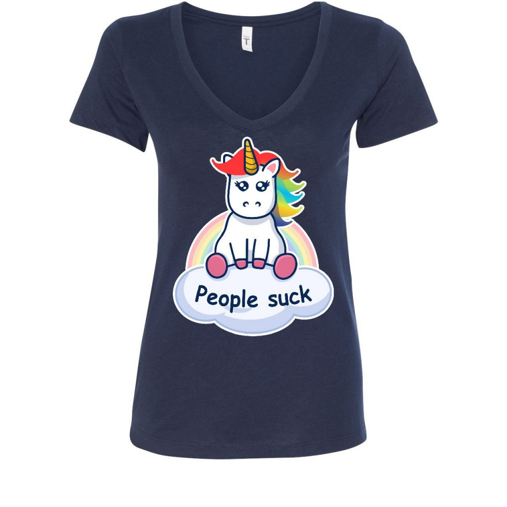 PEOPLE SUCK cute unicorn women's v-neck t-shirt funny rainbow pony introvert navy blue
