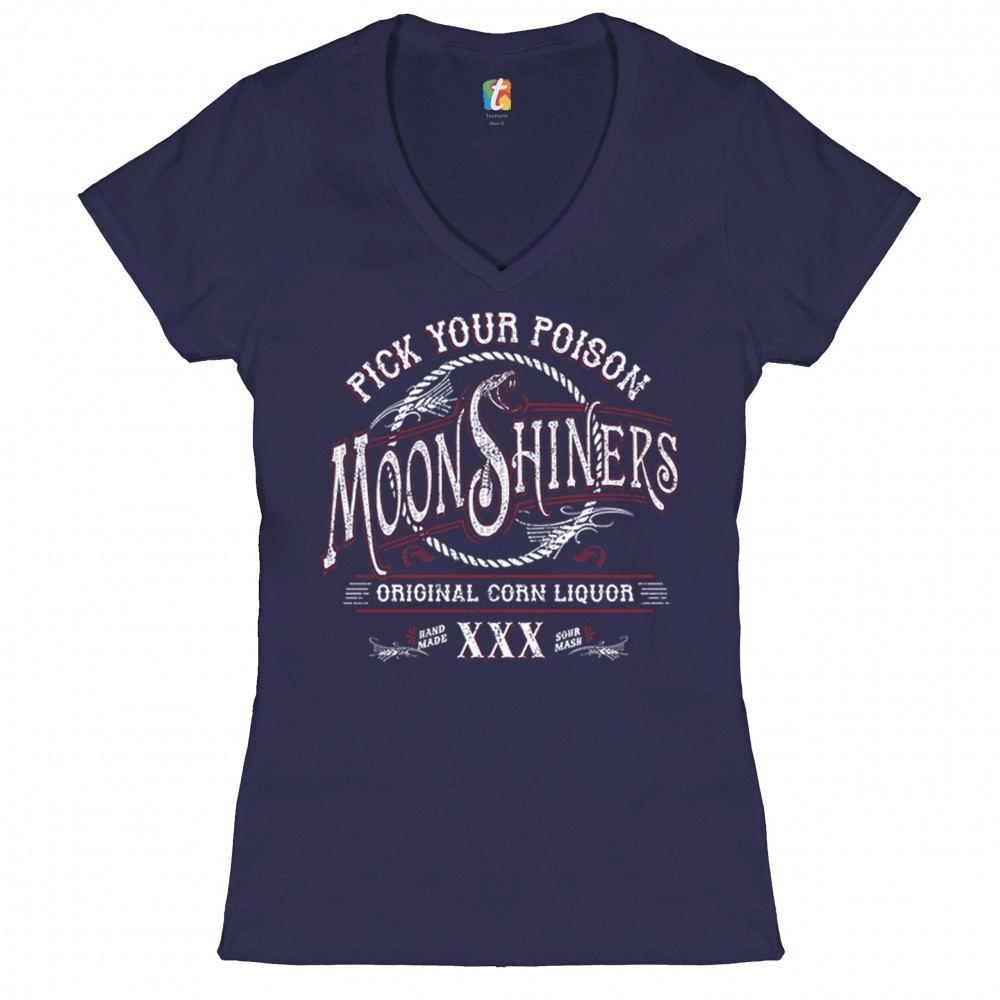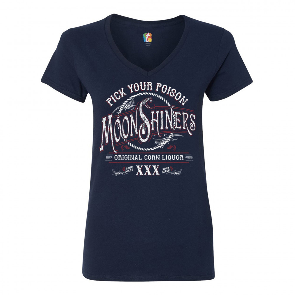 PICK YOUR POISON MOONSHINERS women's v-neck t-shirt original corn liquor tee navy blue