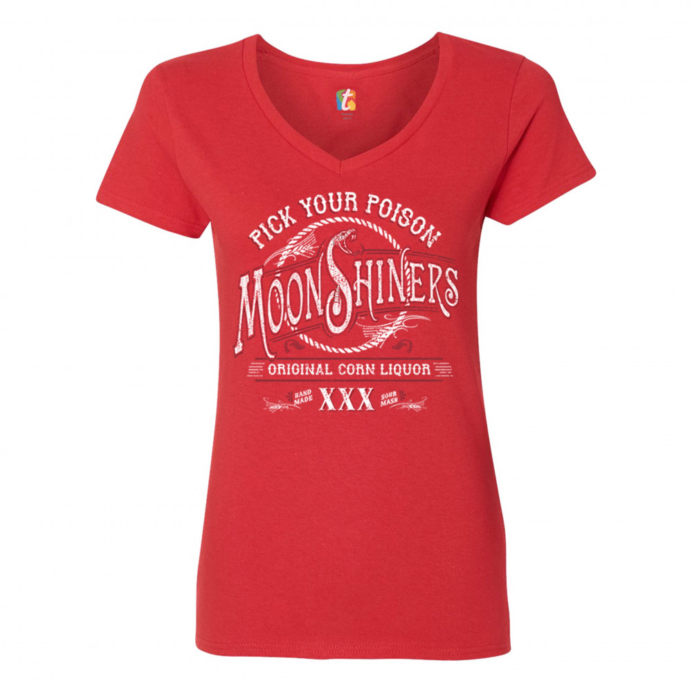 PICK YOUR POISON MOONSHINERS women's v-neck t-shirt original corn liquor tee red