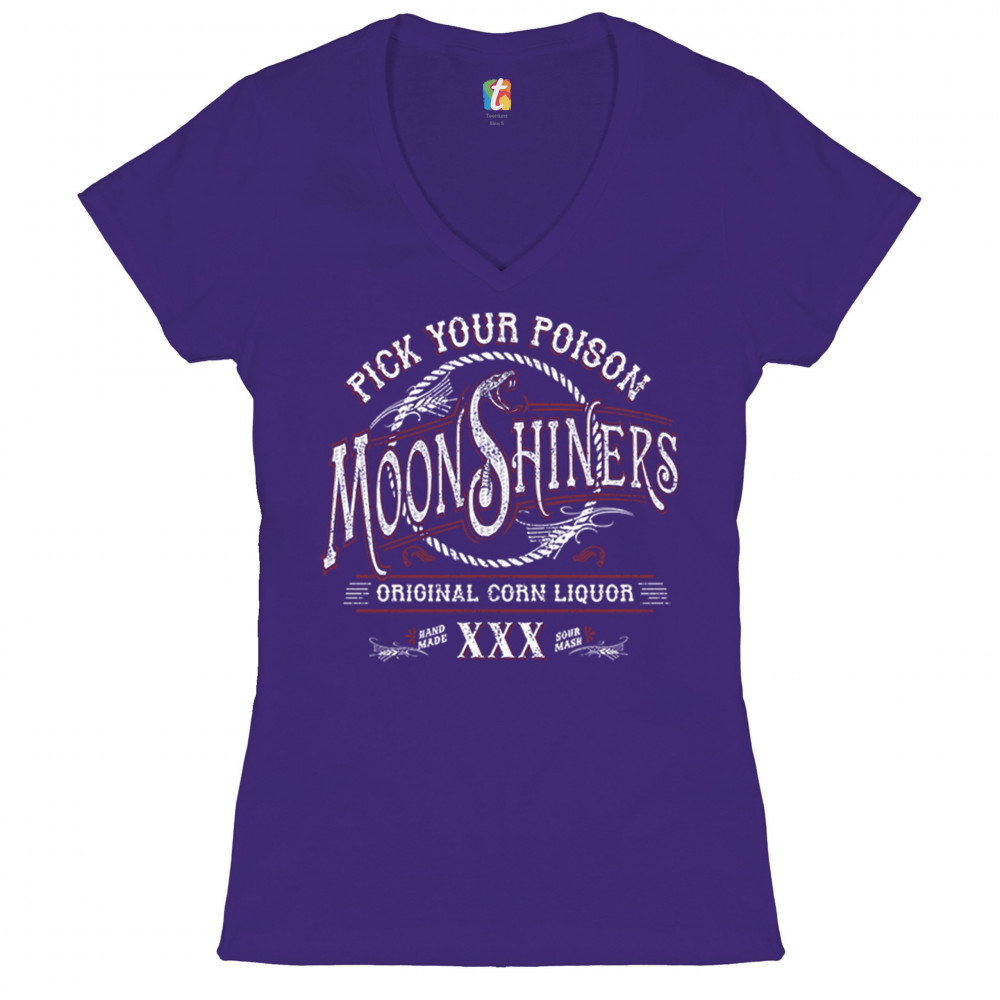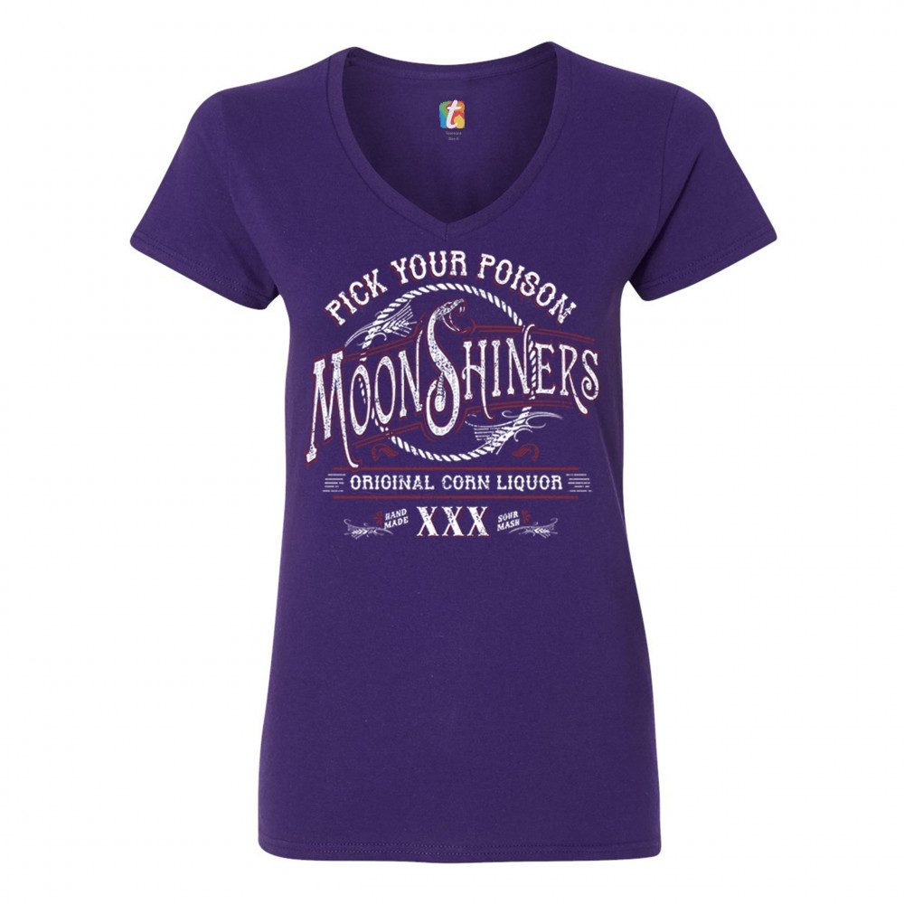 PICK YOUR POISON MOONSHINERS women's v-neck t-shirt original corn liquor tee purple