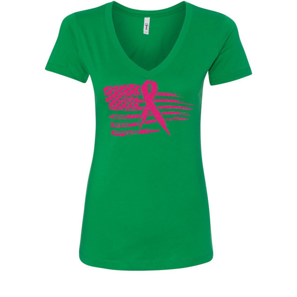 PINK RIBBON AMERICAN FLAG pink ribbon flag women's v-neck t-shirt breast cancer awareness hope survivor green