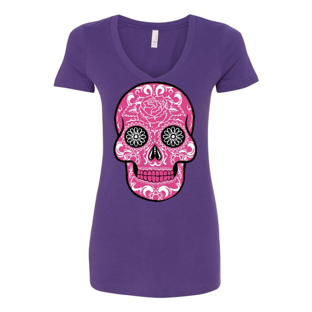 CALAVERA PINK SUGAR SKULL pink sugar skull with roses women's v-neck t-shirt day of the dead purple