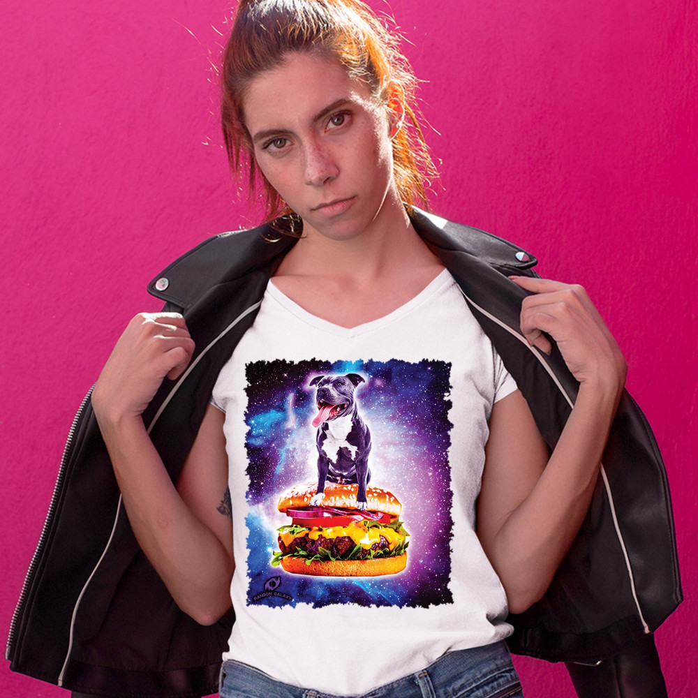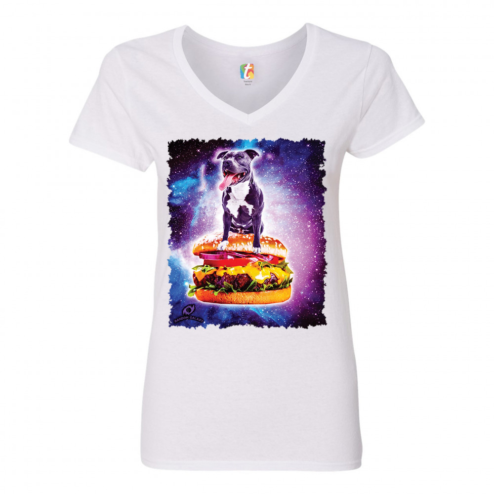 PIT BULL RIDING A BURGER FLYING THROUGH GALAXY women's v-neck t-shirt dog tee white