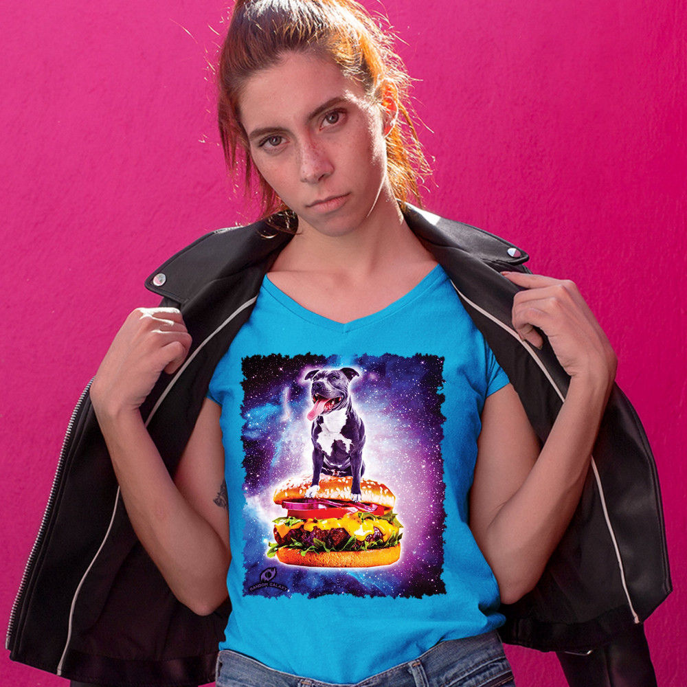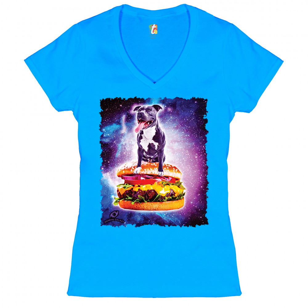 PIT BULL RIDING A BURGER FLYING THROUGH GALAXY women's v-neck t-shirt dog tee turquoise