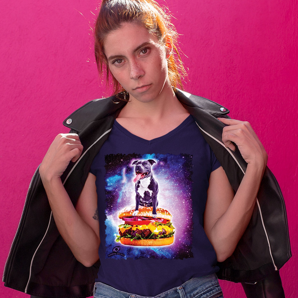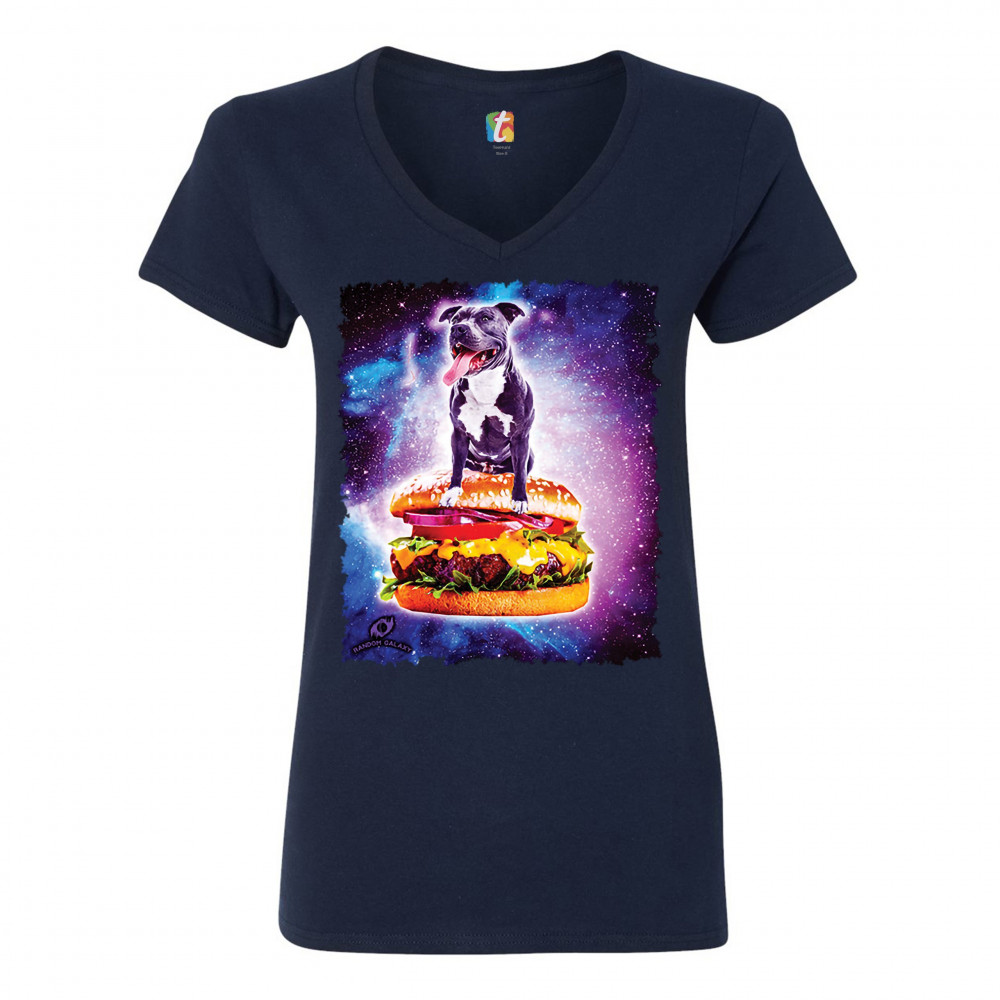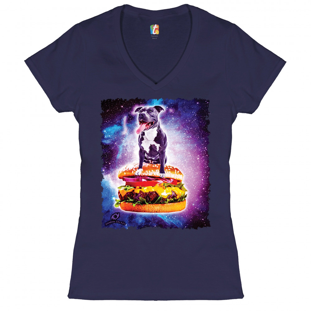 PIT BULL RIDING A BURGER FLYING THROUGH GALAXY women's v-neck t-shirt dog tee navy blue