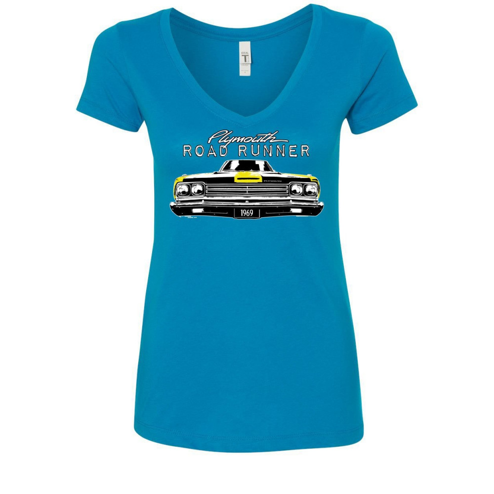 PLYMOUTH ROAD RUNNER 1969 women's v-neck t-shirt route 66 american made classic turquoise