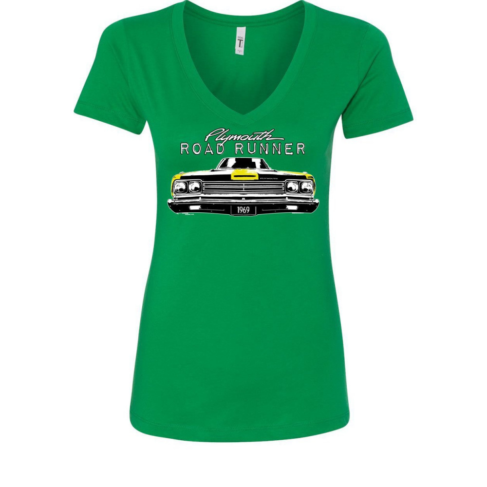PLYMOUTH ROAD RUNNER 1969 women's v-neck t-shirt route 66 american made classic green