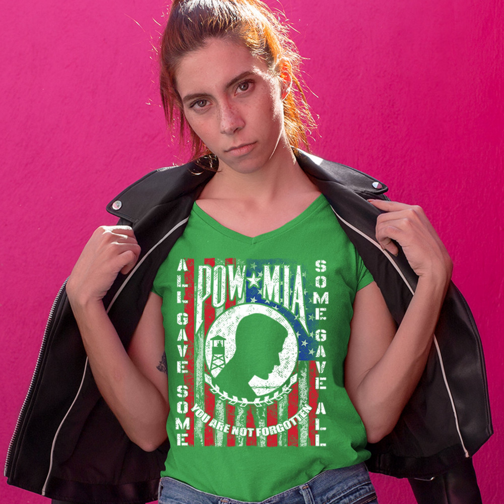A patriotic print featuring the combination of the National League of Families' POW/MIA flag with a distressed American flag. On the sides of the flag it features the phrase: "All Gave Some, Some Gave All". Great choice to wear on Patriot's Day, Memorial